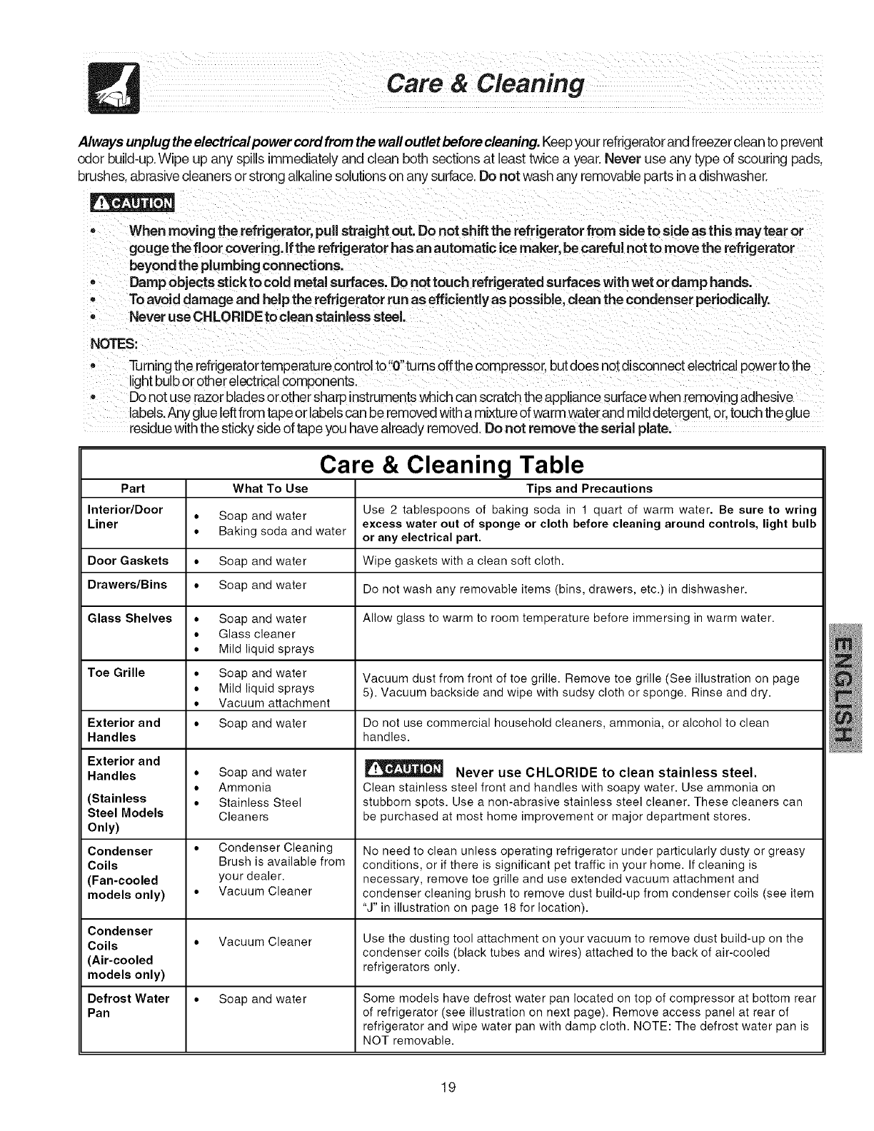 Handles • Soap and water _ Never use CHLORIDE to clean stainless steel.