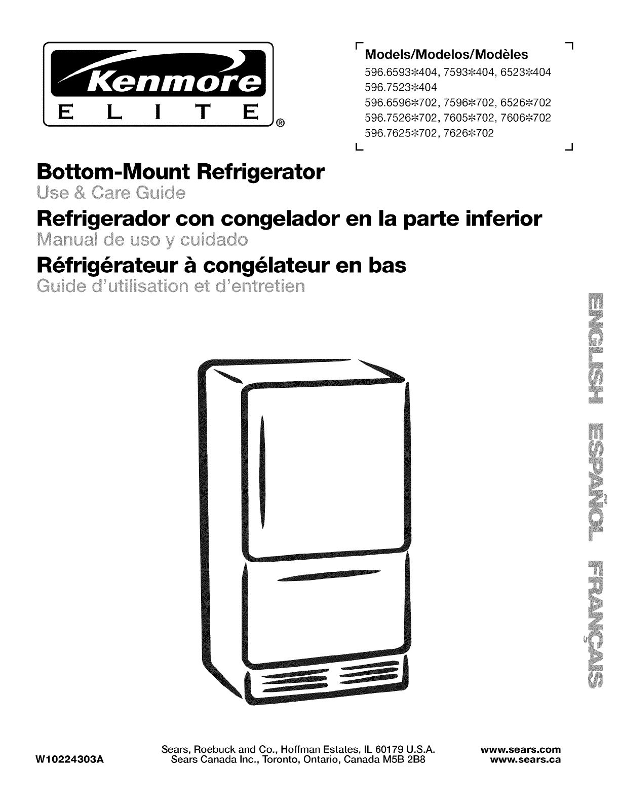 KENMORE ELITE Bottom Mount Refrigerator Manual L0910288 KENMORE ELITE Bottom Mount Refrigerator Owner's Manual, KENMORE ELITE Bottom Mount Refrigerator installation guides
