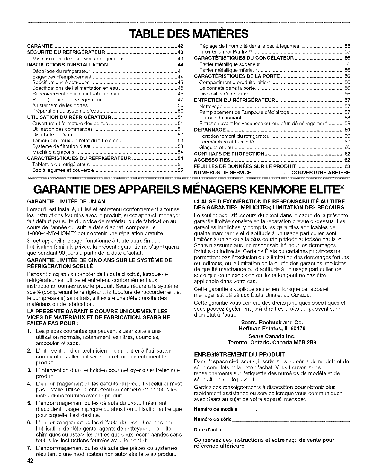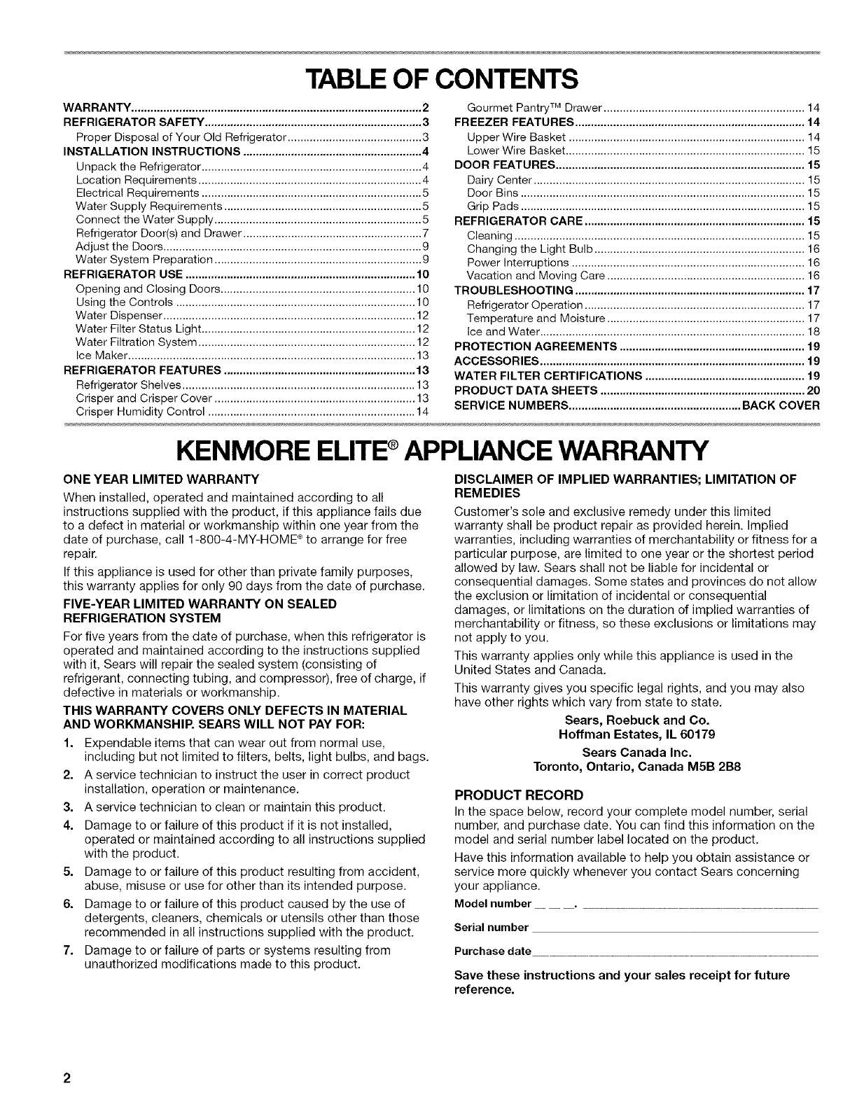 KENMORE ELITE Bottom Mount Refrigerator Manual L0801758 KENMORE ELITE Bottom Mount Refrigerator Owner's Manual, KENMORE ELITE Bottom Mount Refrigerator installation guides