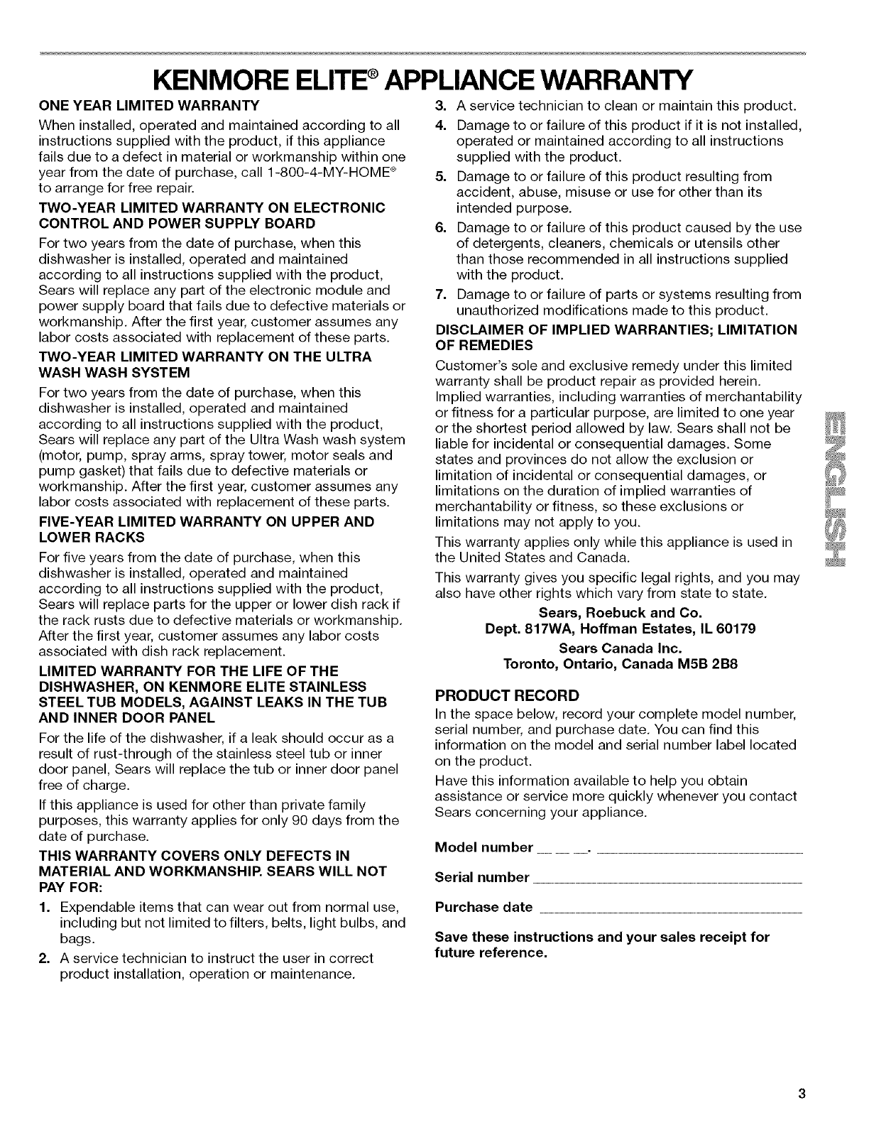 KENMORE ELITE Dishwasher Manual L0710035 KENMORE ELITE Dishwasher Owner's Manual, KENMORE ELITE Dishwasher installation guides