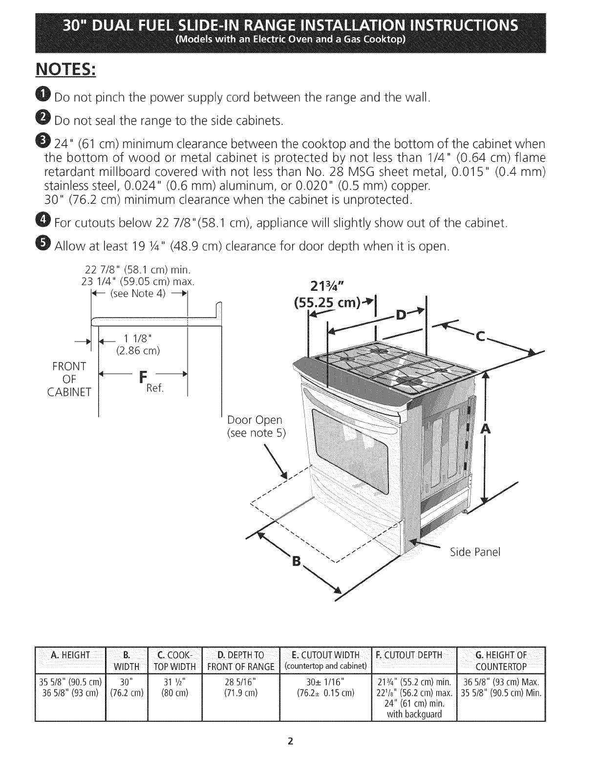 A, HEIGHT B, C. COOK_ D, DEPTHTO [ E, CUTOUTWIDTH F.CUTOUTDEPTH ,G. HEIGHTOF