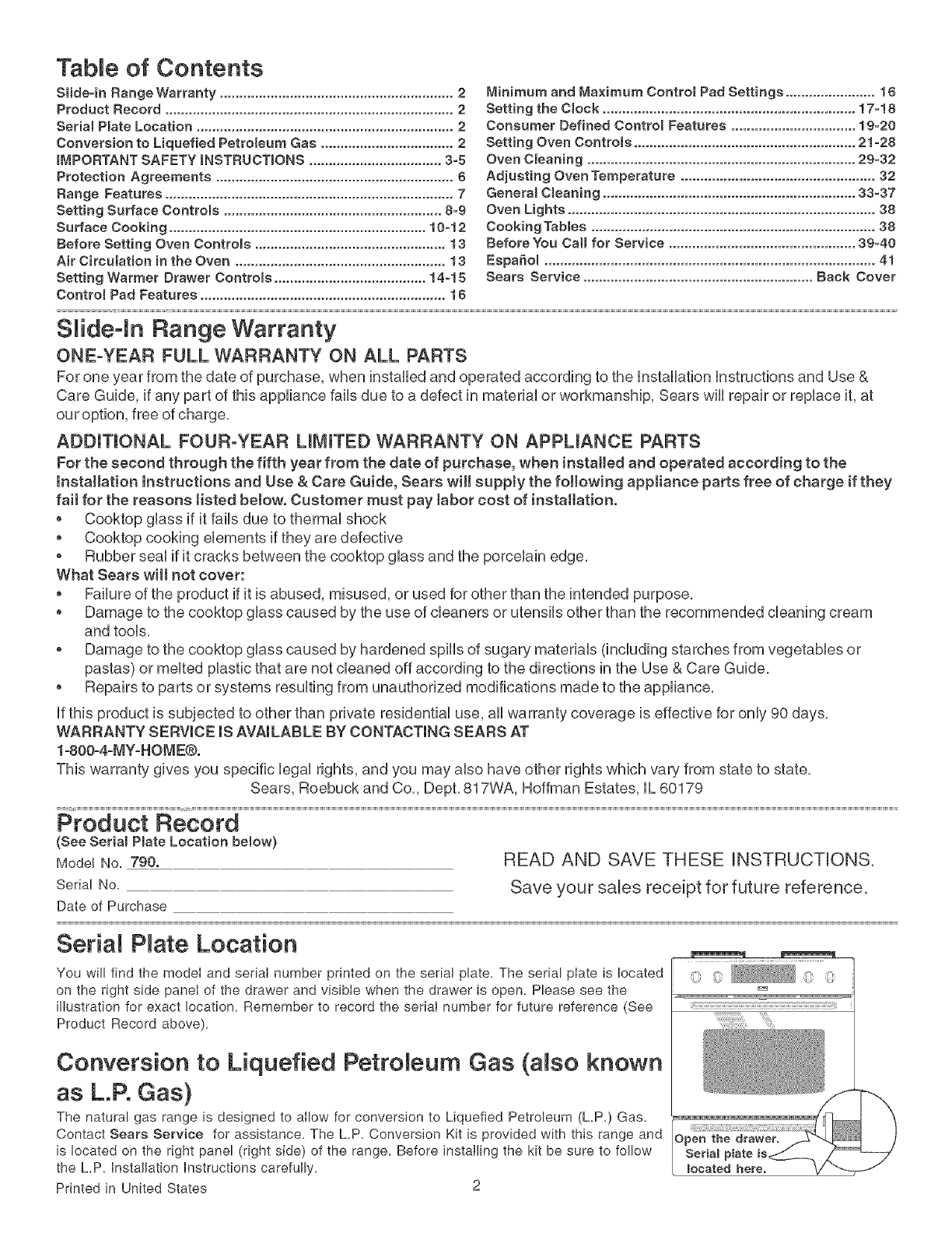 Contact Sears Service for assistance. The LP. Conversion Kit is provided with this range and Open the drawer,