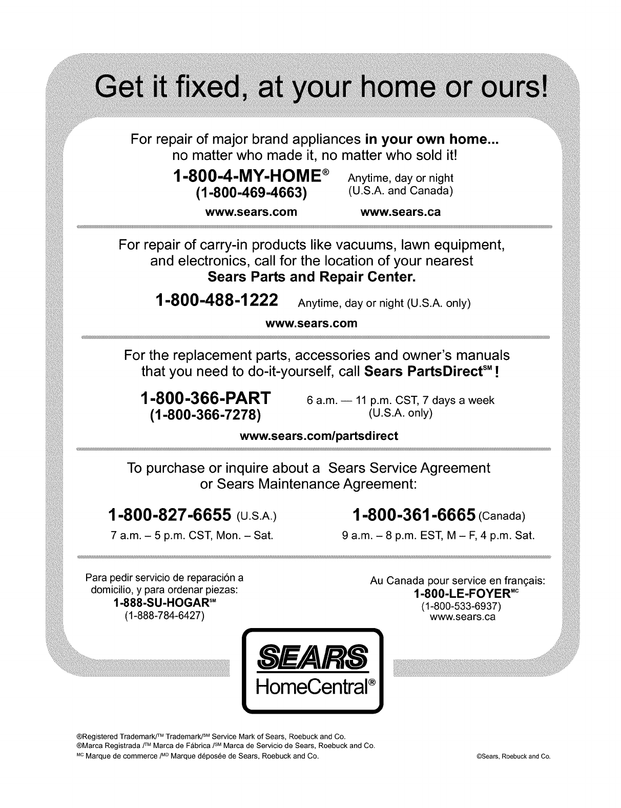 For information concerning Sears Canada Maintenance Agreements, call 1-800-361-6665.