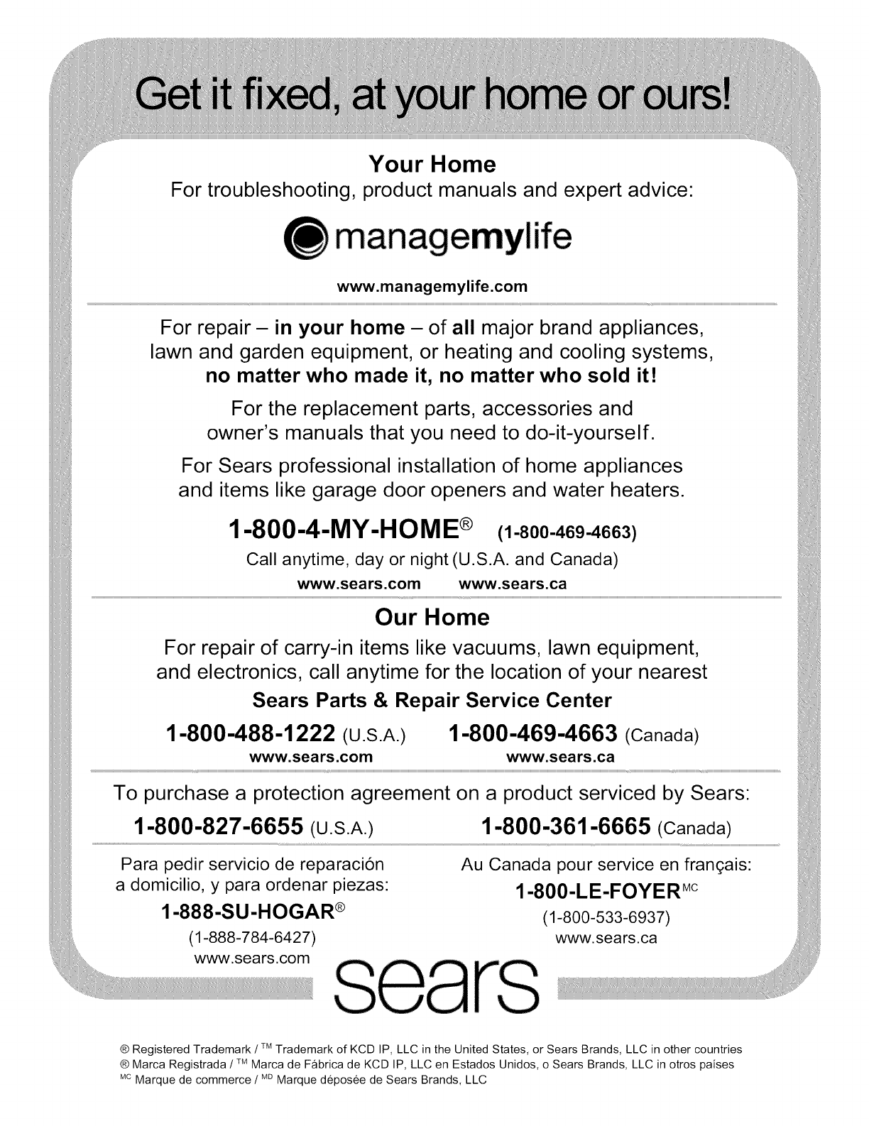 ®Registered Trademark /TMTrademark of KCD IP, LLC in the United States, or Sears Brands, LLC in other countries