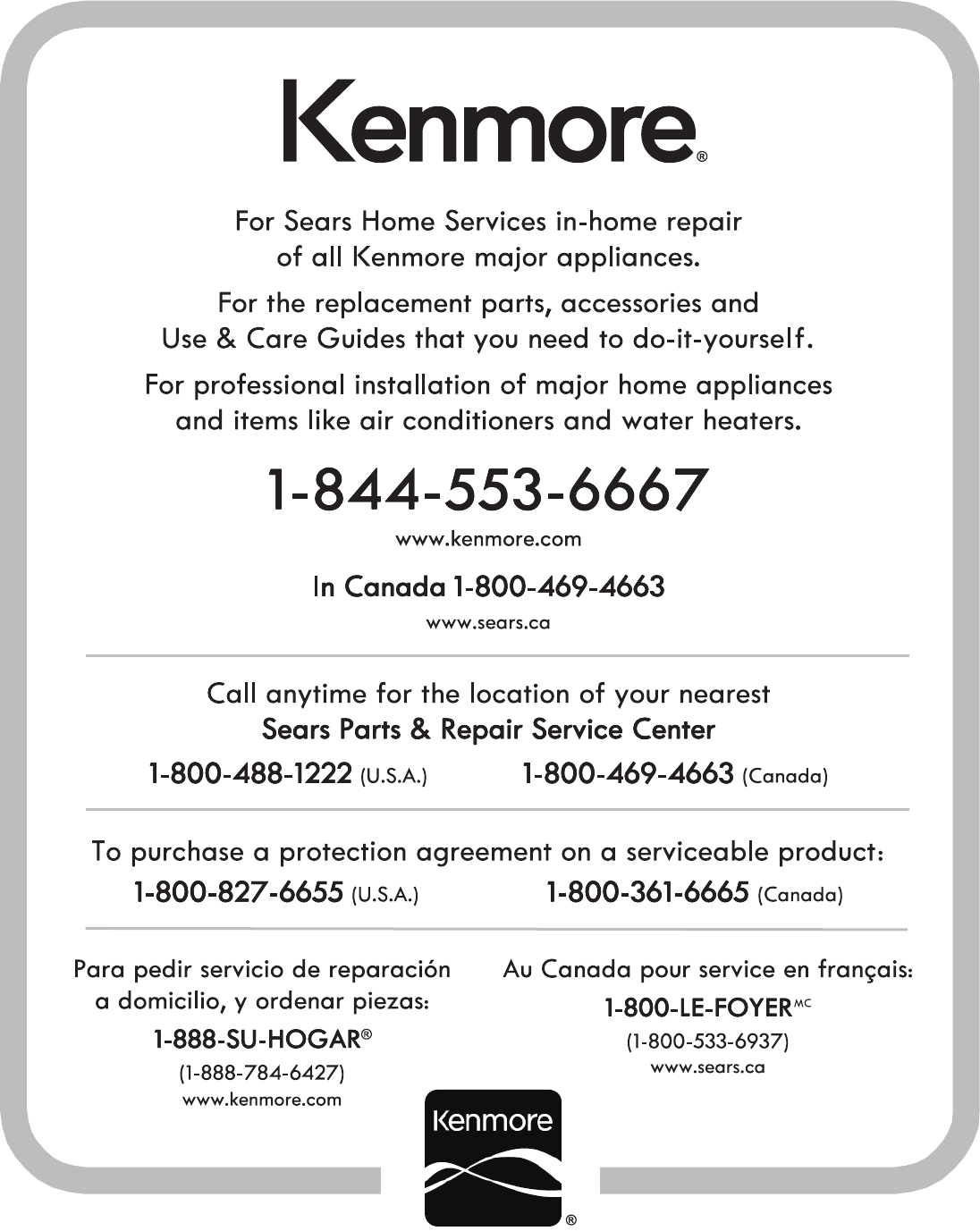 For warranty coverage details to obtain free repair or replacement, visit the web page: www.kenmore.com/