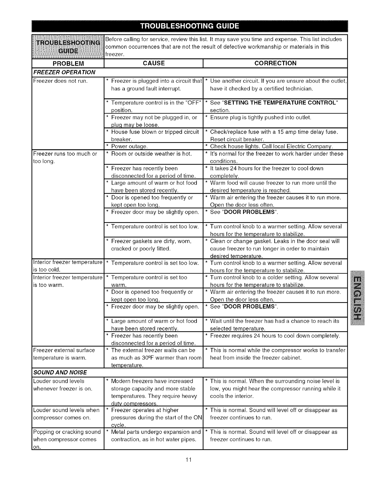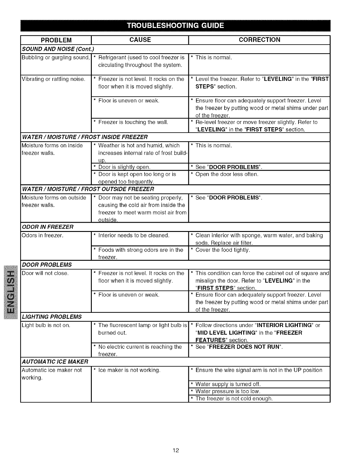Vibrating or rattling noise. * Freezer is not level. It rocks on the * Level the freezer. Refer to "LEVELING" in the "FIRST