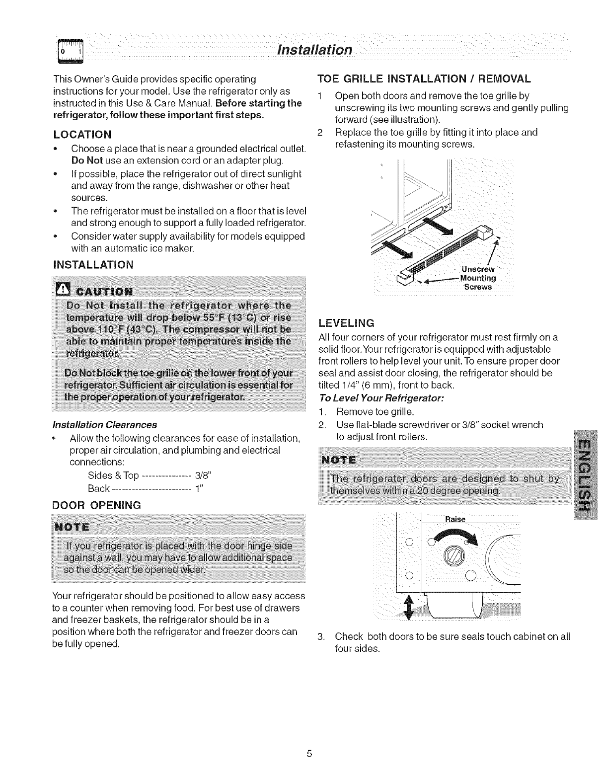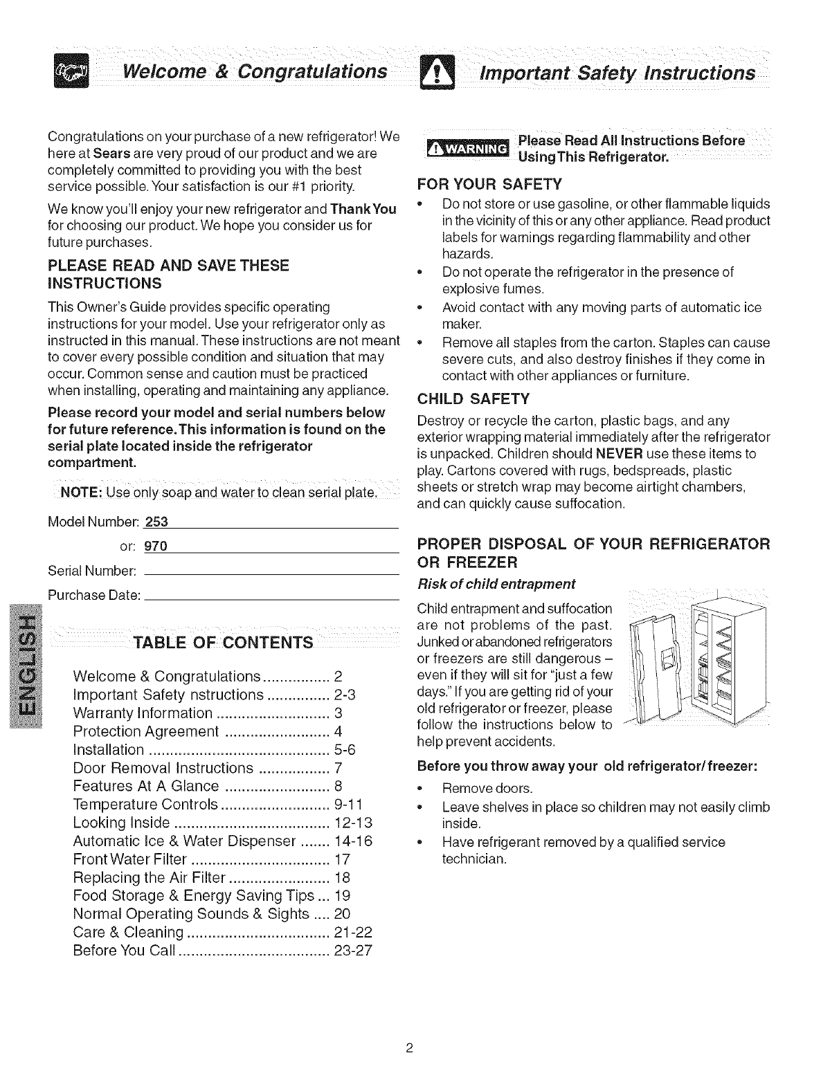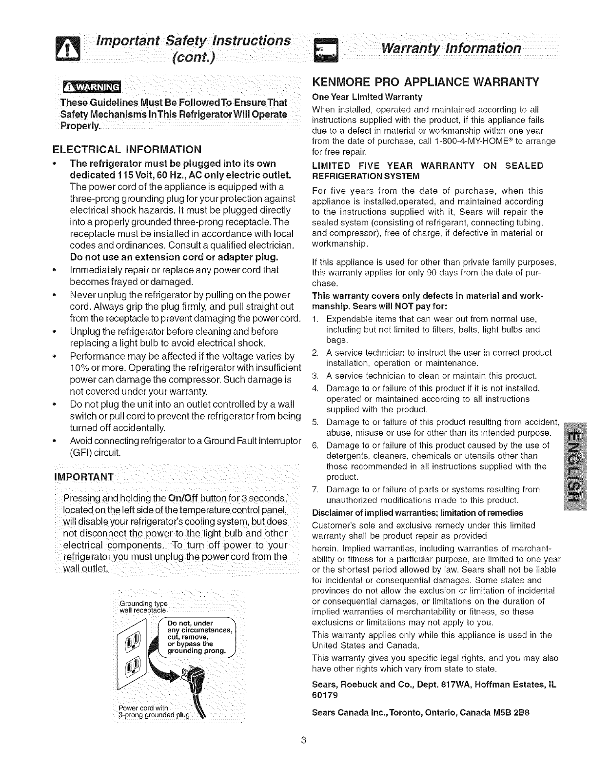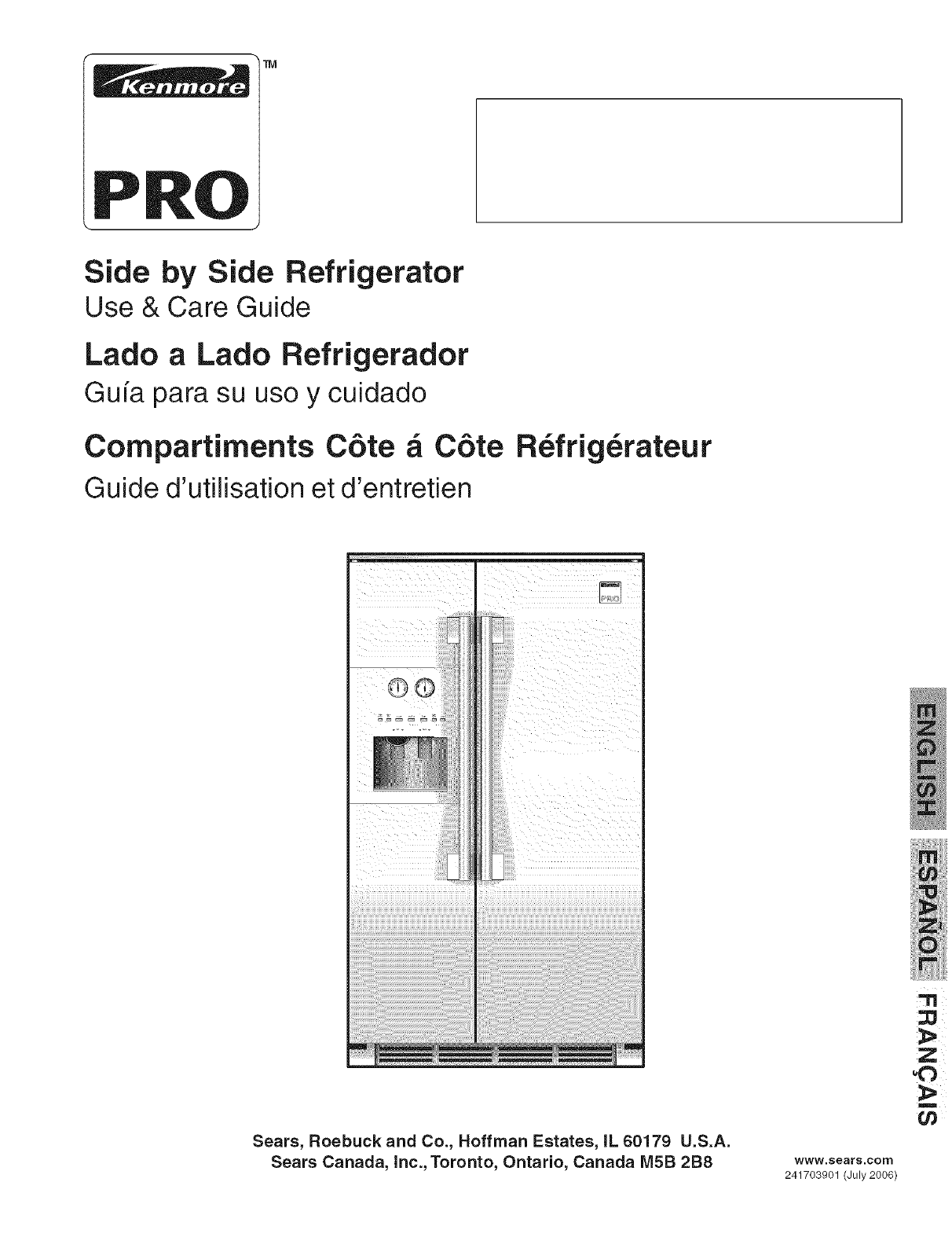 KENMORE PRO Side by Side Refrigerator Manual L0608052 KENMORE PRO Side by Side Refrigerator Owner's Manual, KENMORE PRO Side by Side Refrigerator installation guides