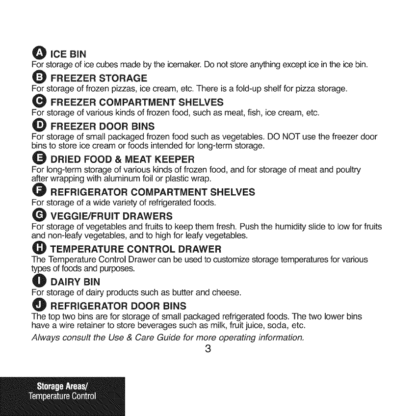 For storage of ice cubes made by the icemaker. Do not store anything except ice inthe ice bin.