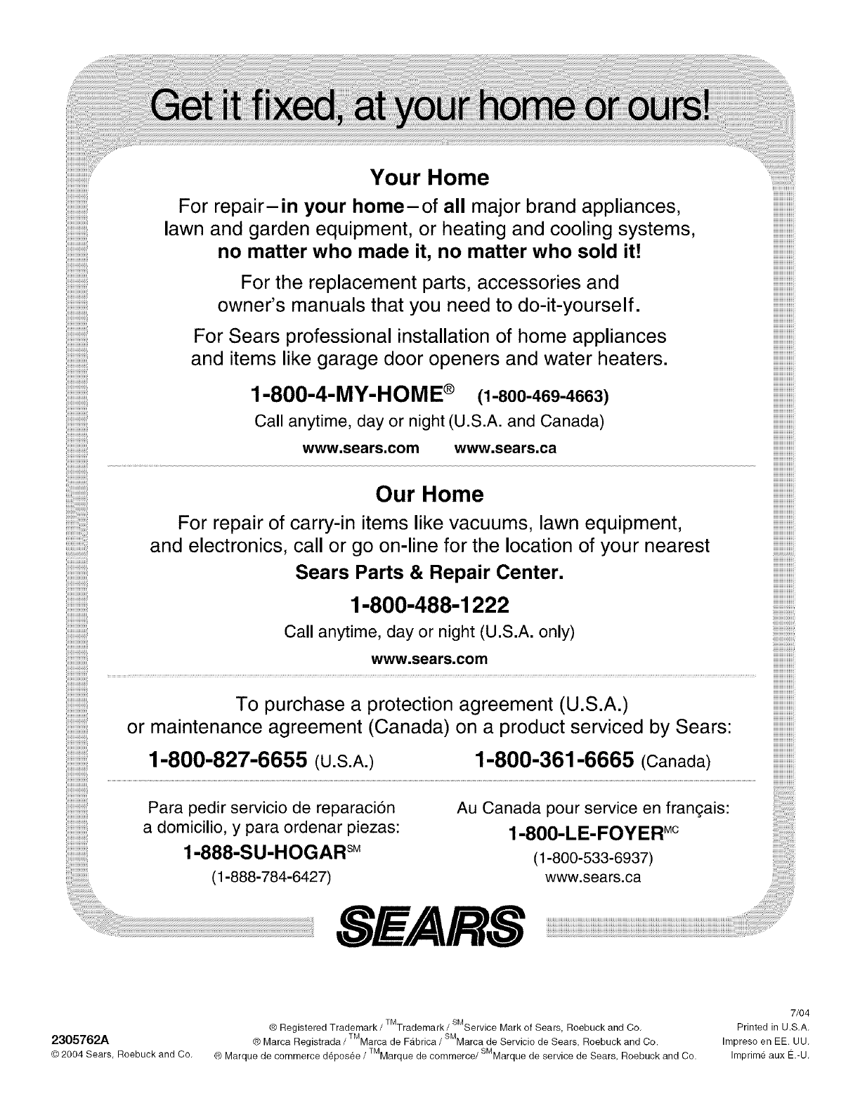 Sears Roebuck and Co., Hoffman Estates, IL 60179 U.S.A. www.sears.com