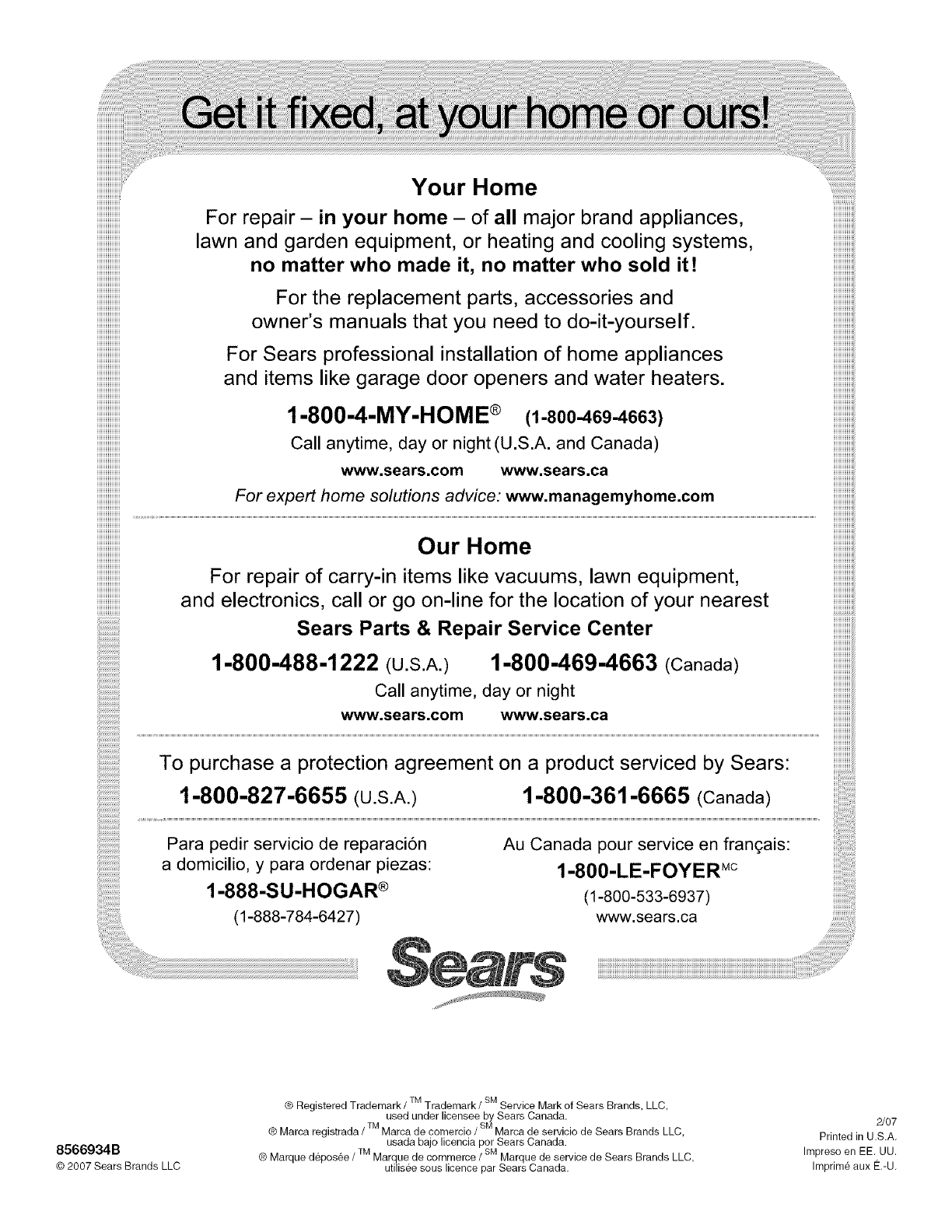 ® Marca reglstrada /Marca de comerclo /Marca de servicio de Sears Brands LLC, Printed in U.S.A,