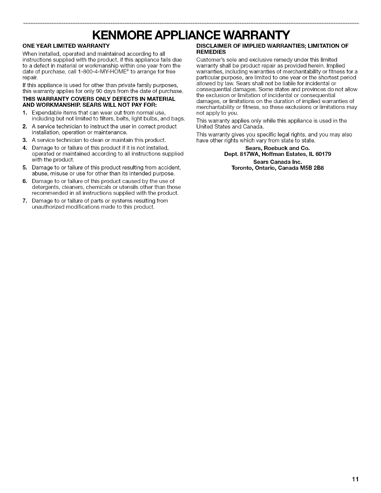 User Manual: Kenmore 11027751700 11027751700 KENMORE RESIDENTIAL WASHER - Manuals and Guides View the owners manual for your KENMORE RESIDENTIAL WASHER #11027751700. Home:Laundry & Garment Care Parts:Kenmore Parts:Kenmore RESIDENTIAL WASHER Manual