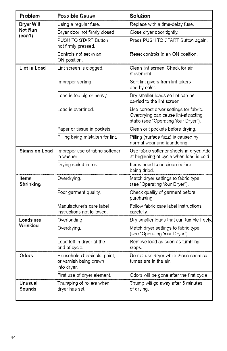 Stains on Load Improper use of fabric softener Use fabric softener sheets in dryer. Add