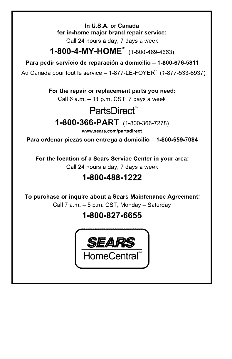 Sears Service Center, call 1-800-4-MY-HOME sM