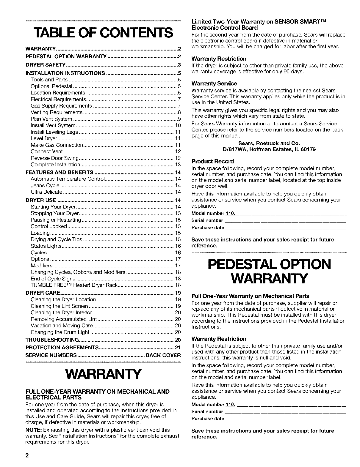 PEDESTAL OPTION WARRANTY ................................................. 2