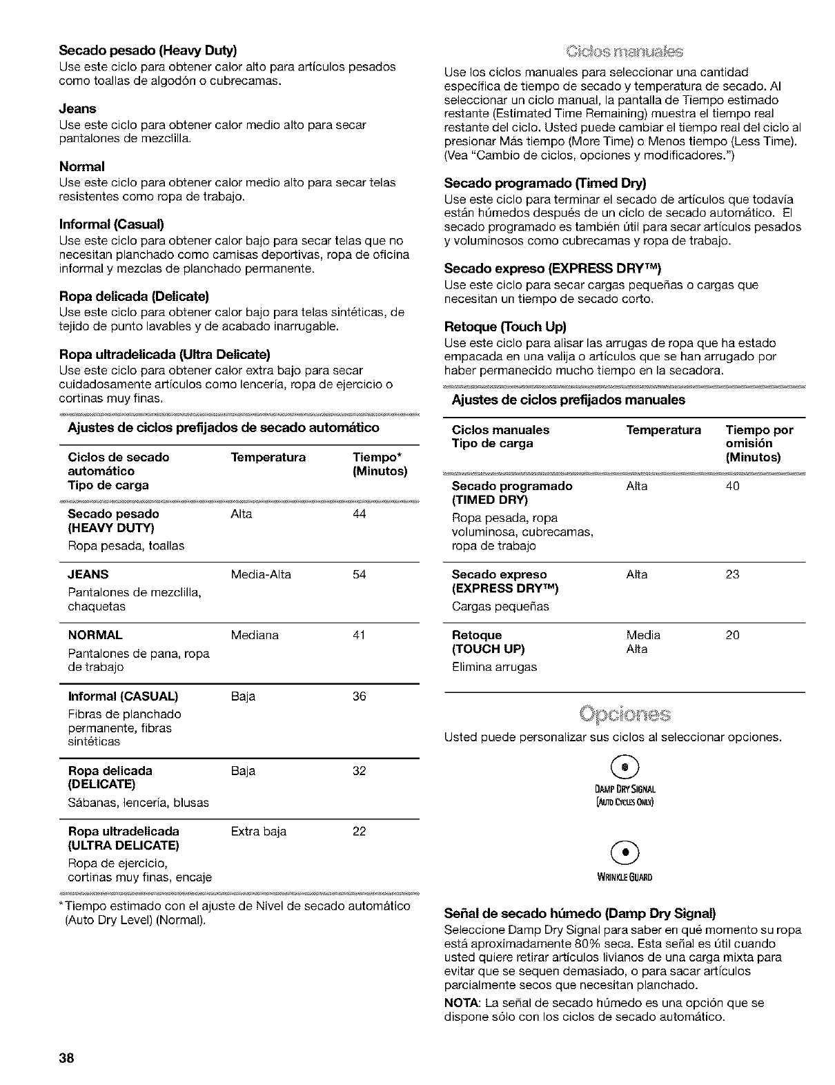 de la secadora de acuerdo al tipo de carga (yea "Ciclos").