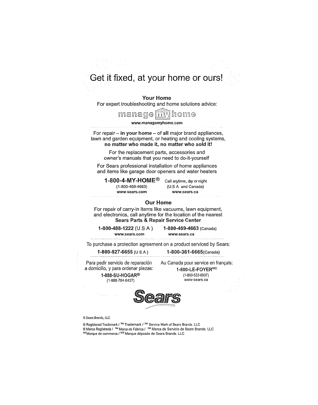 ® Mama Registrada lTM Marca de F_brlcafs_ Marca de Serviclo de Sears Brands. LLC