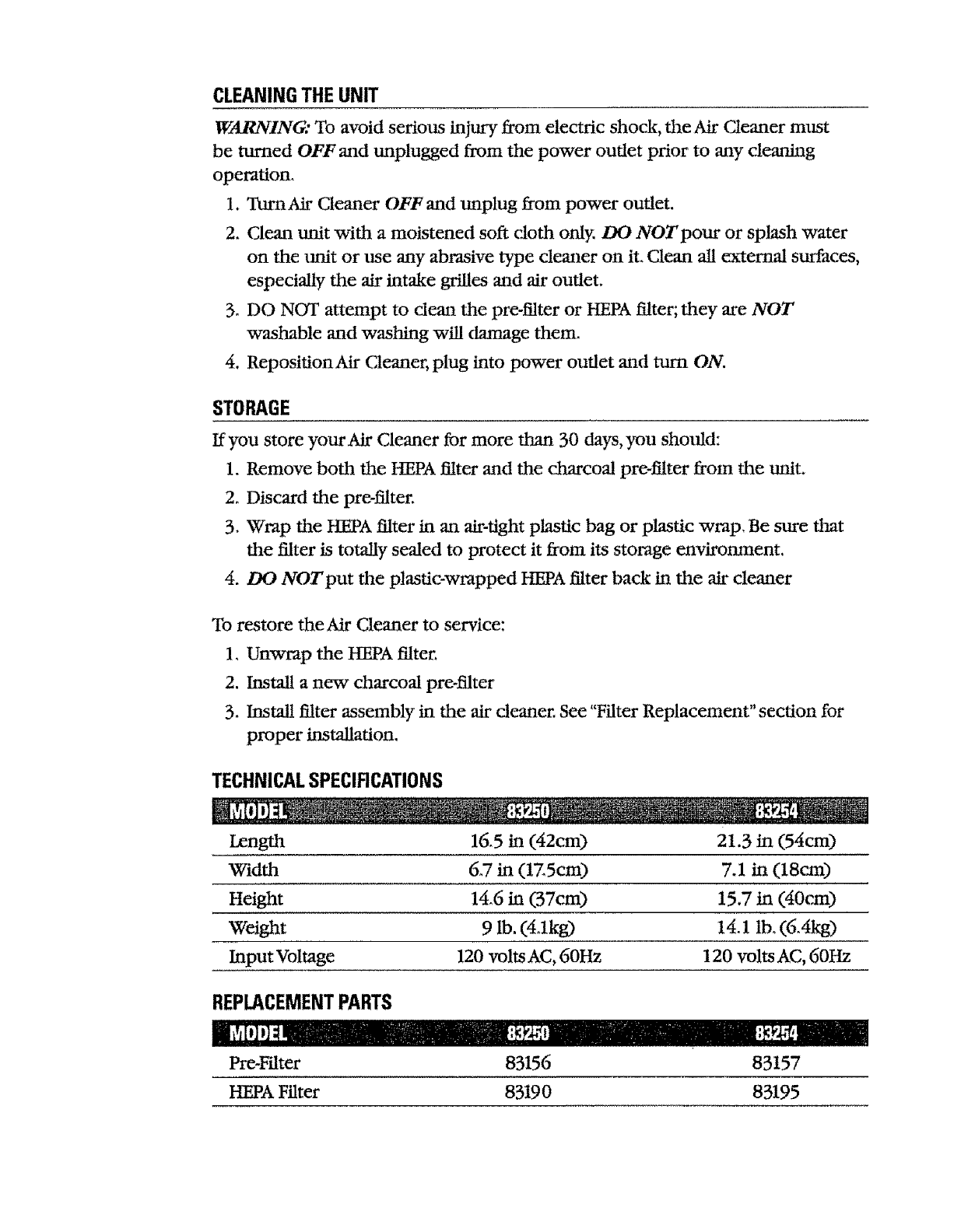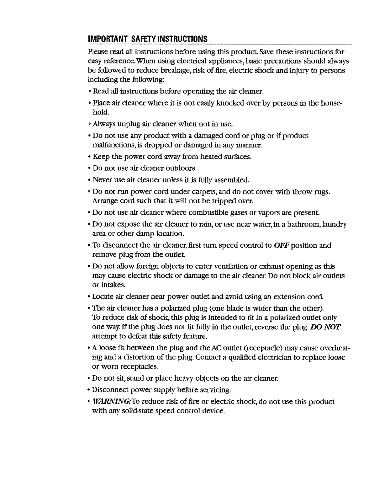 WARNING: To avoid fire or shock hazard, the Air Cleaner should ONLY be