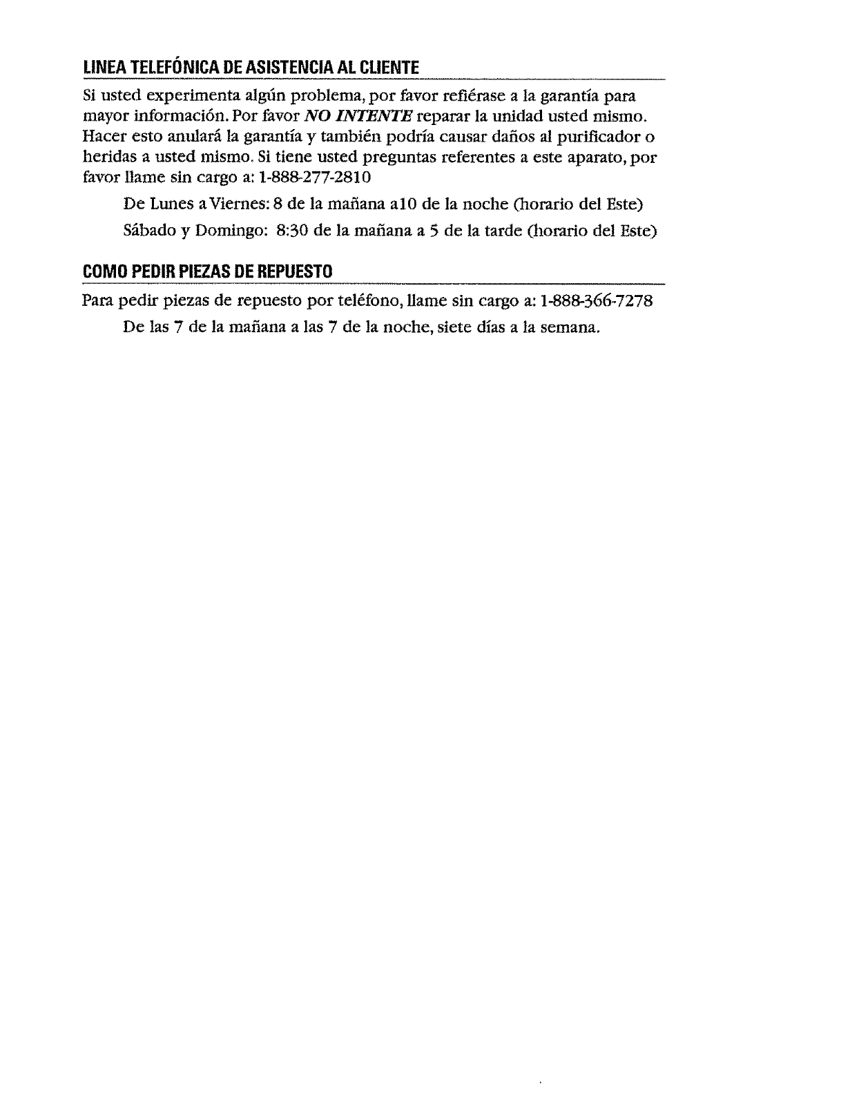 Para pedir piezas de repuesto por tel_fono, name sin cargo a: 1-888-366-7278