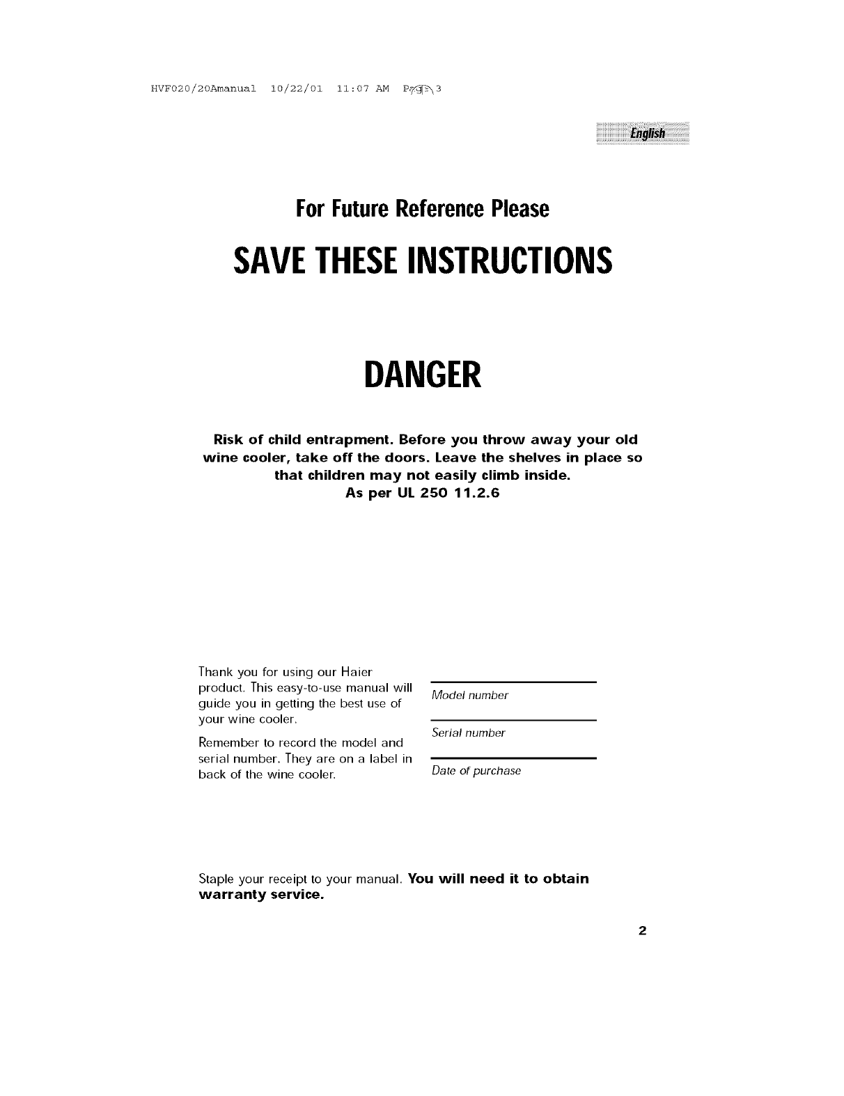 Staple your receipt to your manual. You will need it to obtain