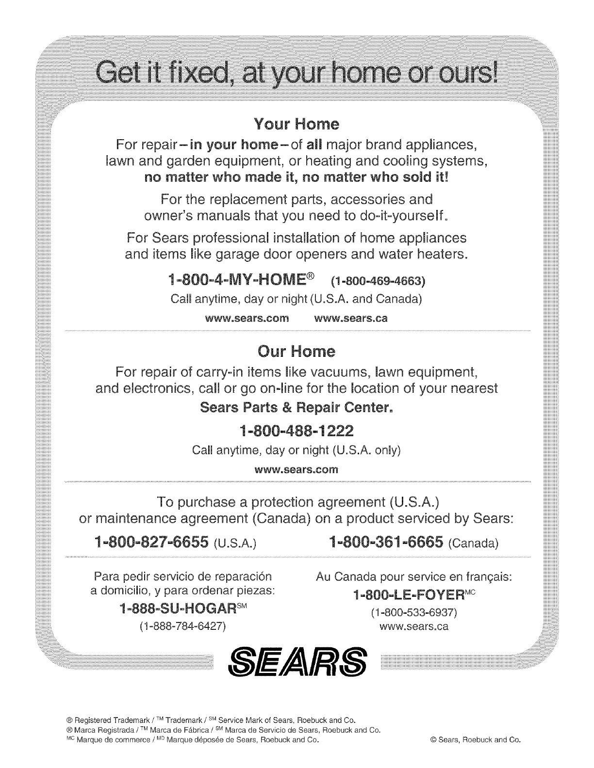 ® Registered Trademark /Trademark /Sewice Mark of Sears, Roebuck and Co.