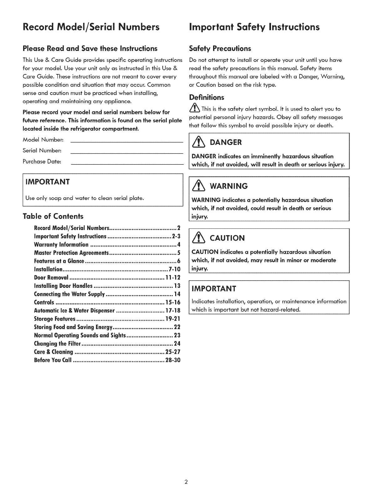 Record Model/Serial Numbers important Safety instructions