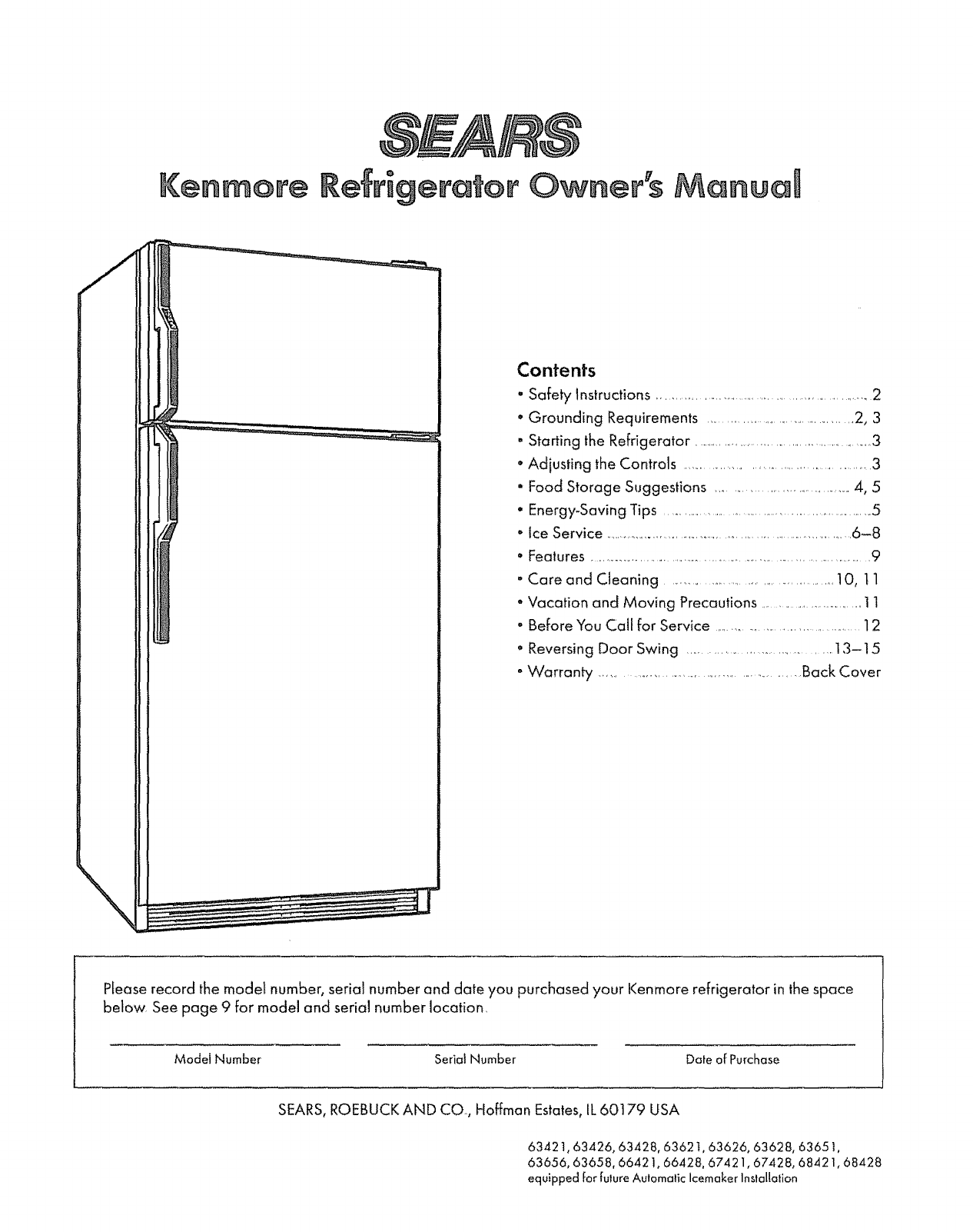 Piease record the model number, serial number and date you purchased your Kenmore refrigerator in the space