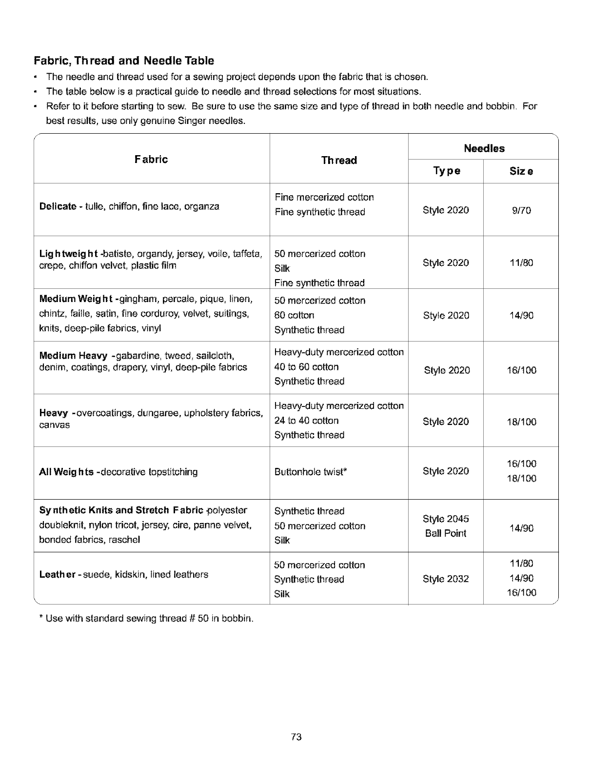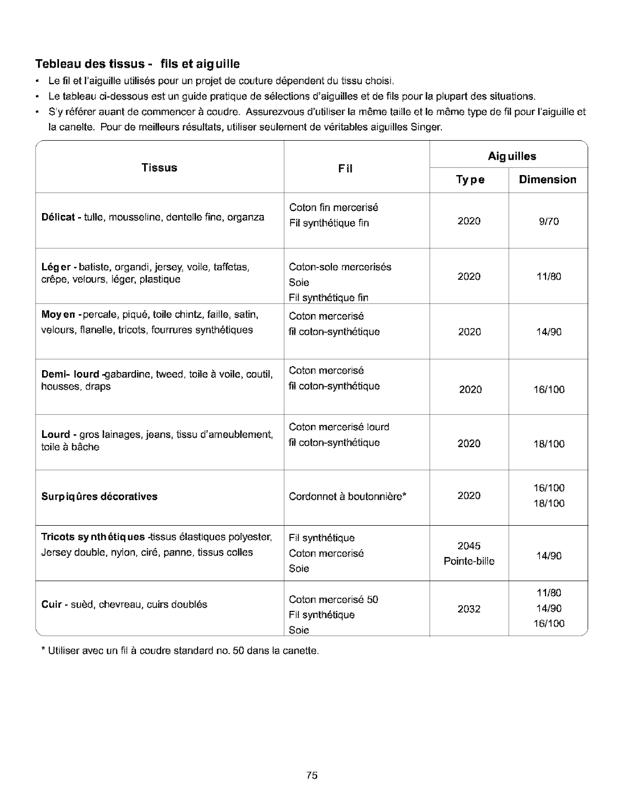 Le tableau ci-dessous est un guide pratique de s61ections d'aiguilles et de ills pour la plupart des situations.