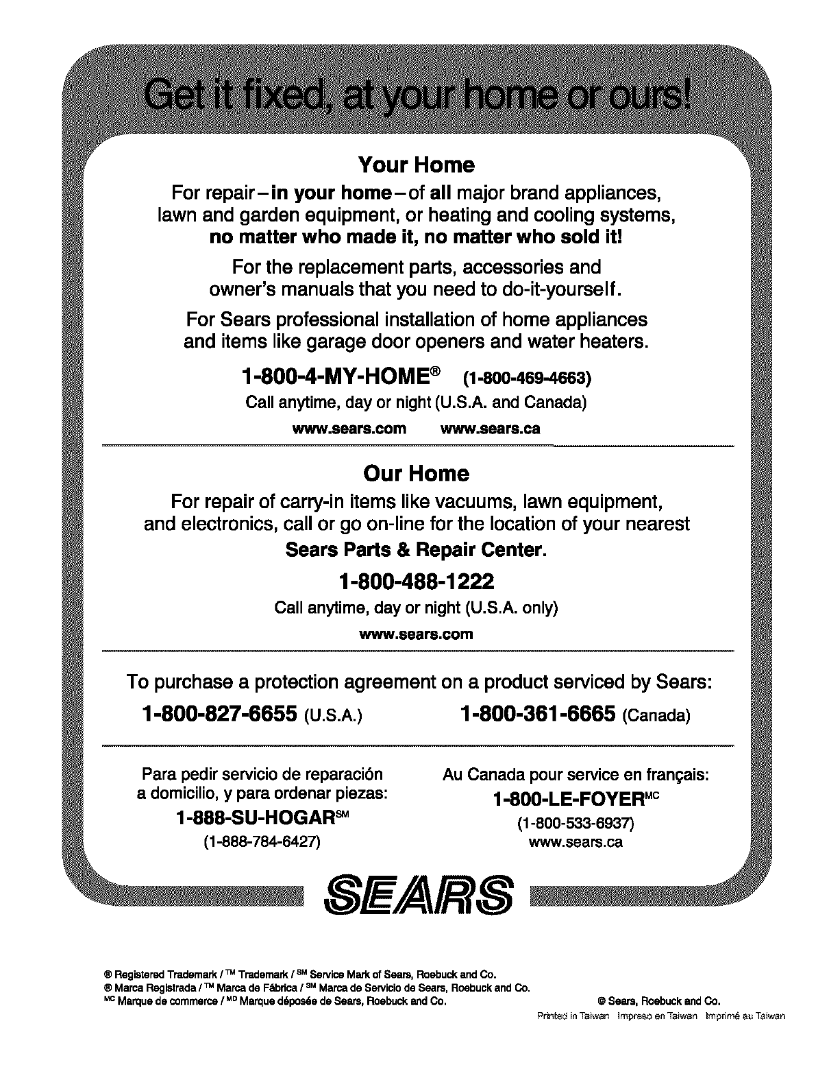 ®Registered Trademark /_4 Trademark /SMService Mark of Sears, Roebuck and Co.