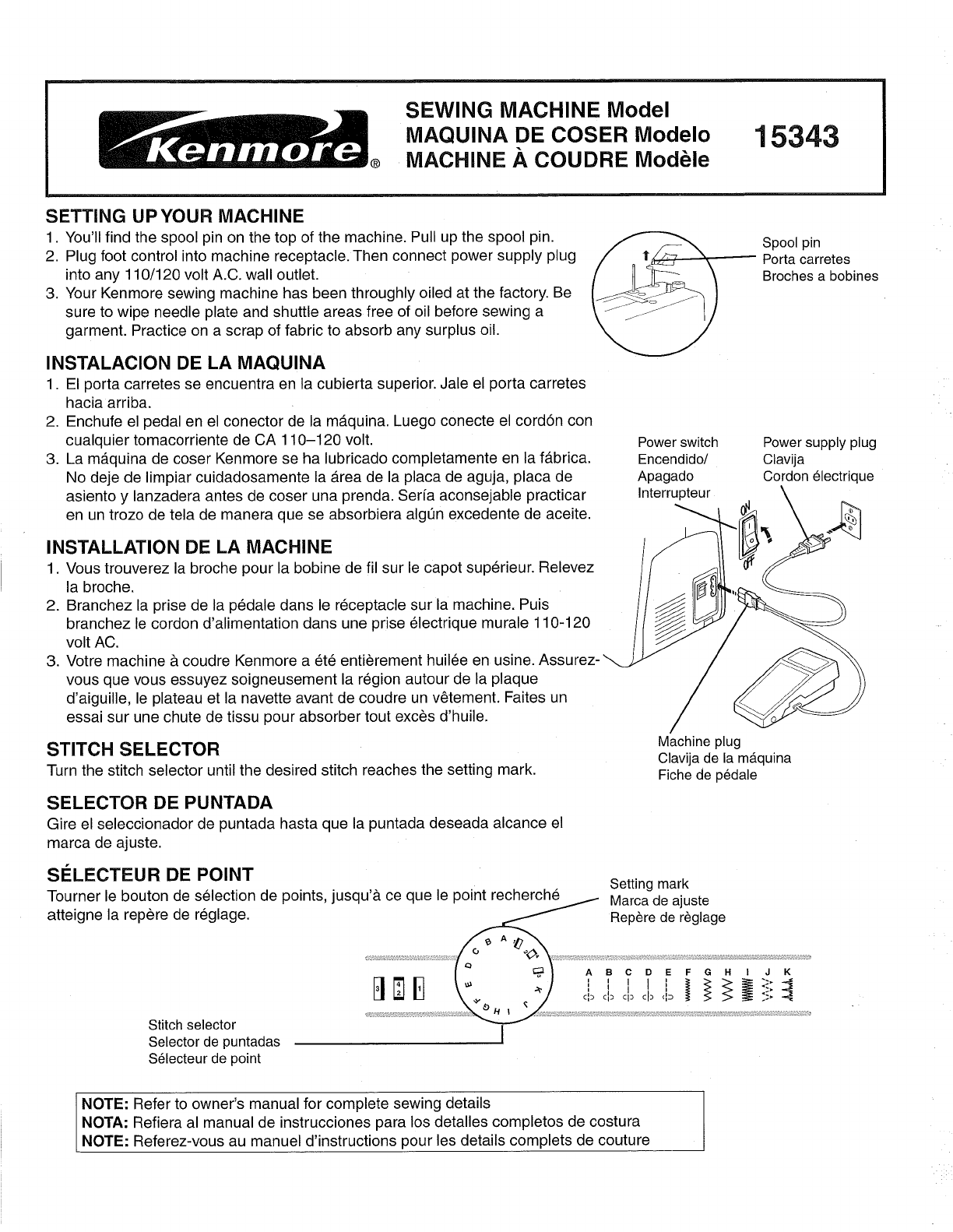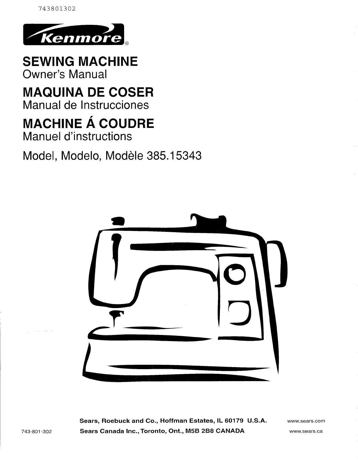 User Manual: Kenmore 38515343600 38515343600 KENMORE SEWING MACHINE - Manuals and Guides View the owners manual for your KENMORE SEWING MACHINE #38515343600. Home:Laundry & Garment Care Parts:Kenmore Parts:Kenmore SEWING MACHINE Manual