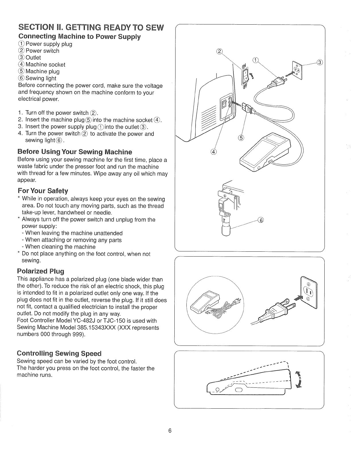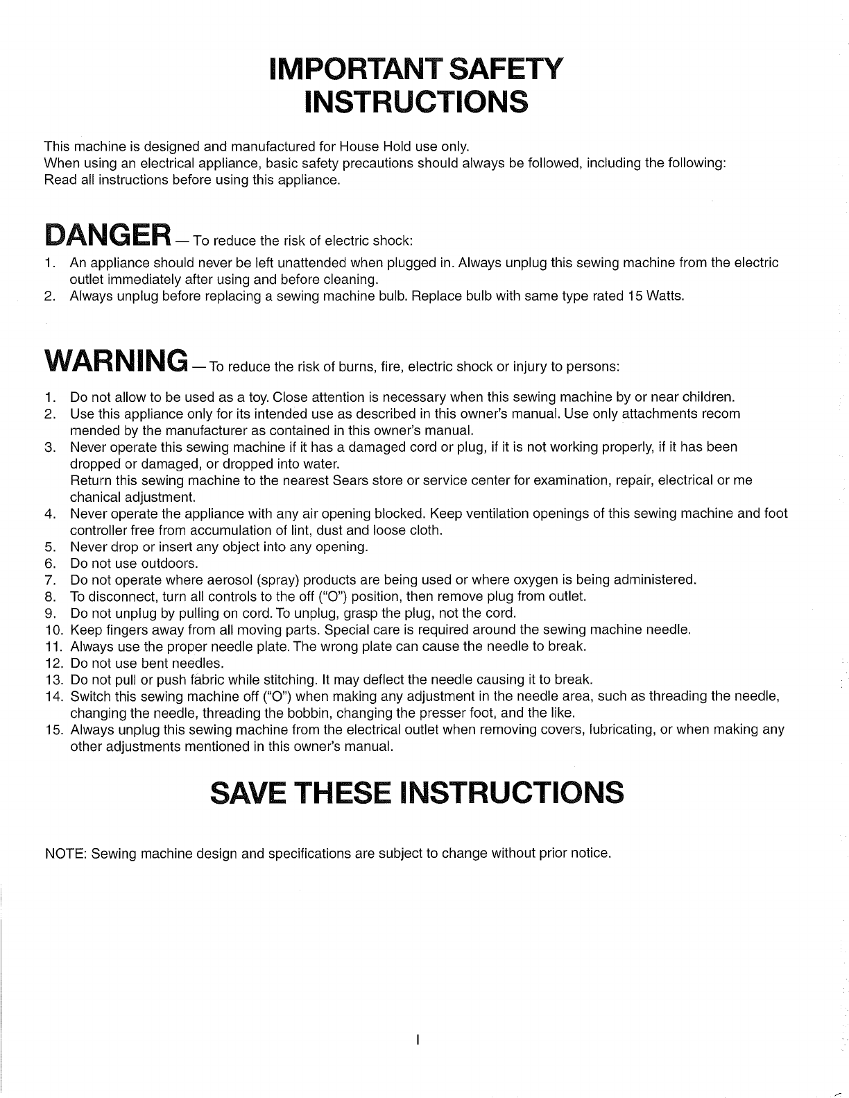 15. Always unplug this sewing machine from the electrical outlet when removing covers, lubricating, or when making any