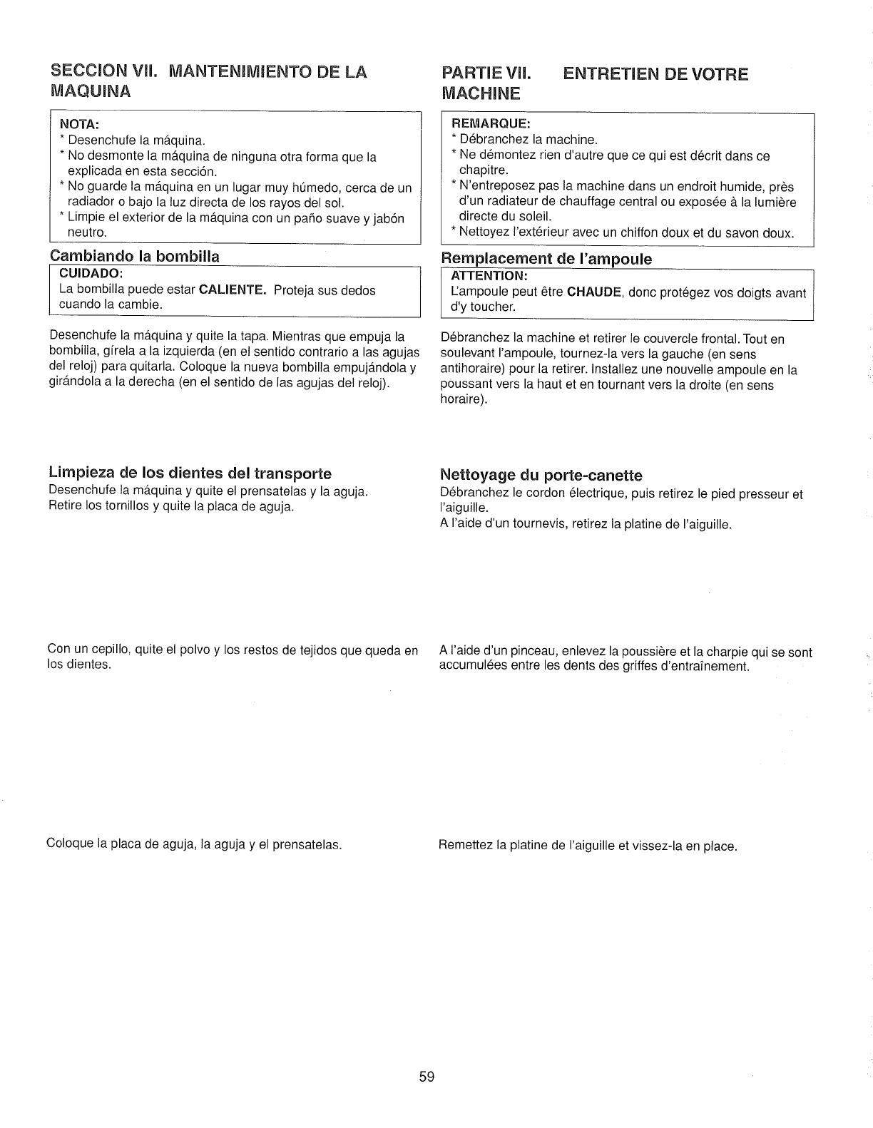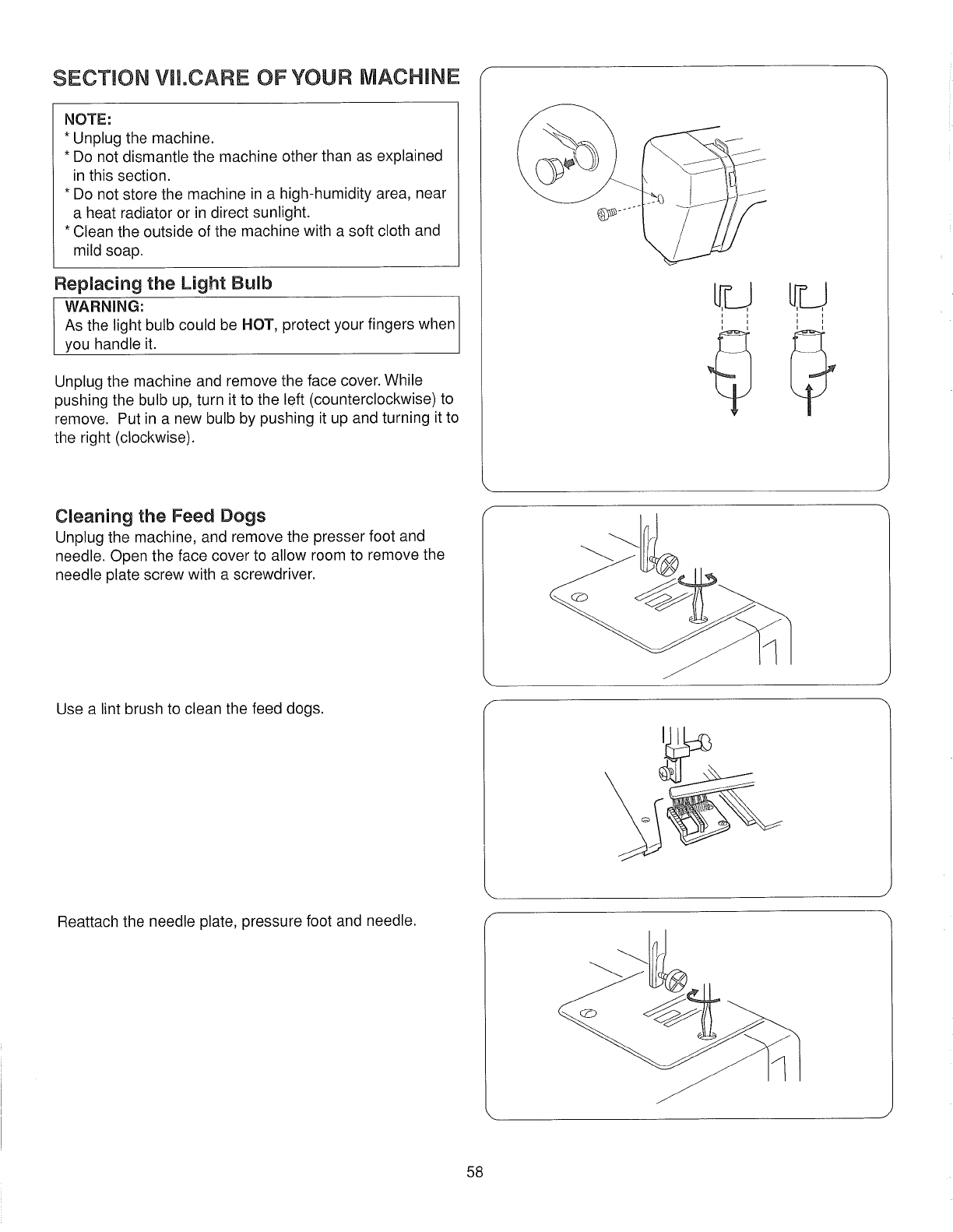 2. Always unplug before replacing a sewing machine bulb. Replace bulb with same type rated 15 Watts.