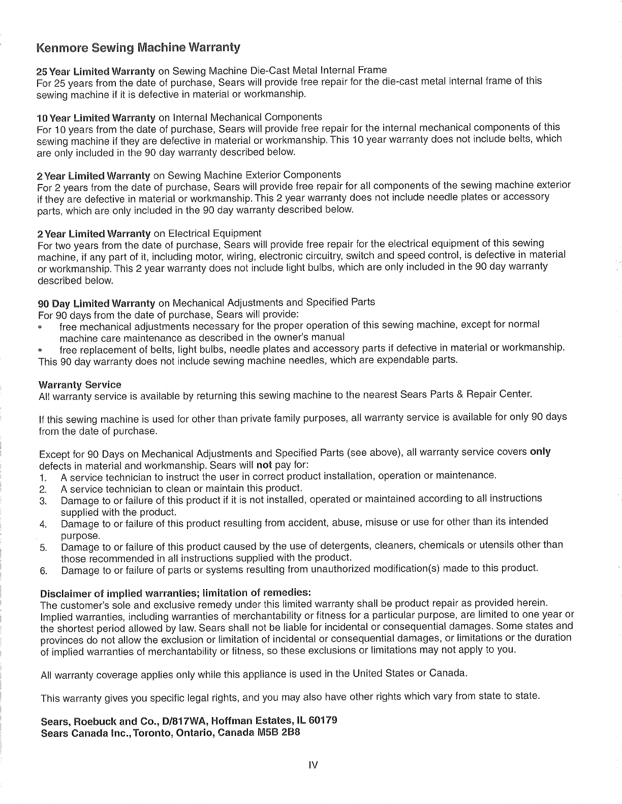 Return this sewing machine to the nearest Sears store or service center for examination, repair, electrical or me