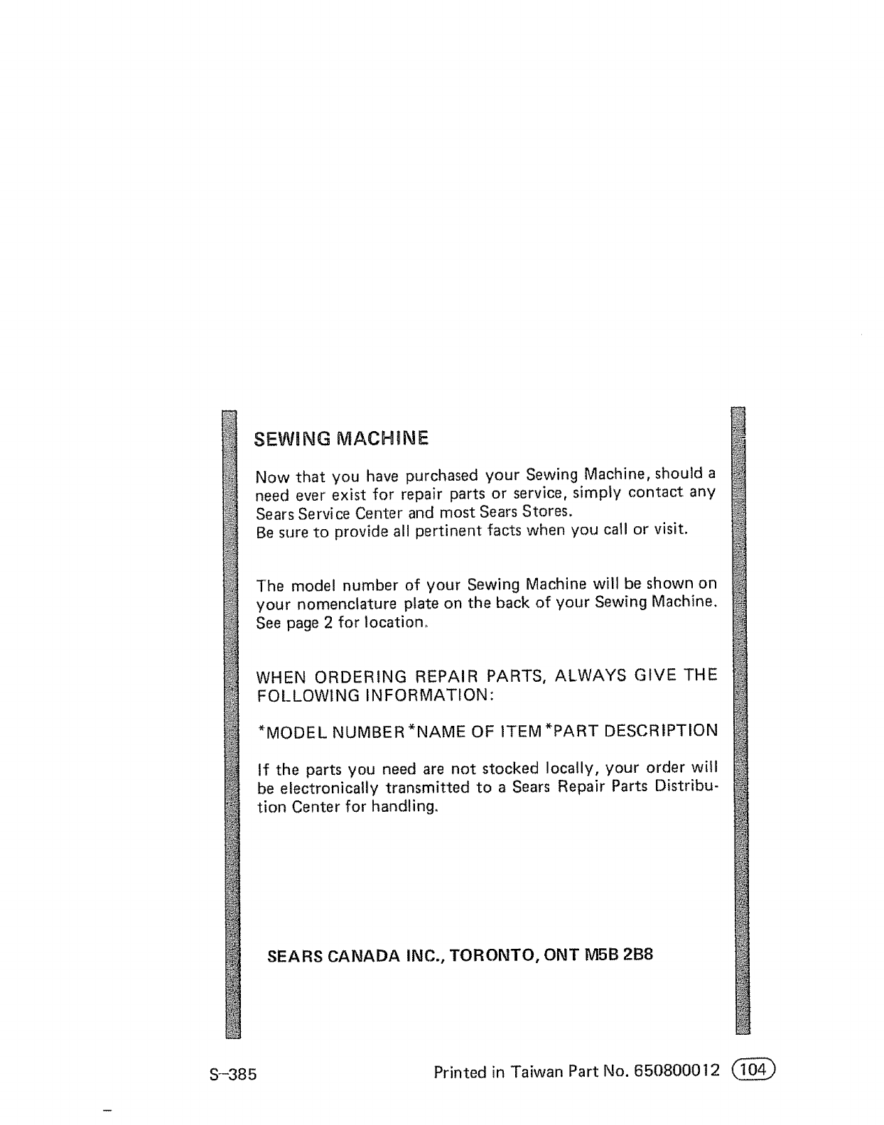 S-385 Printed in Taiwan Part No. 650800012
