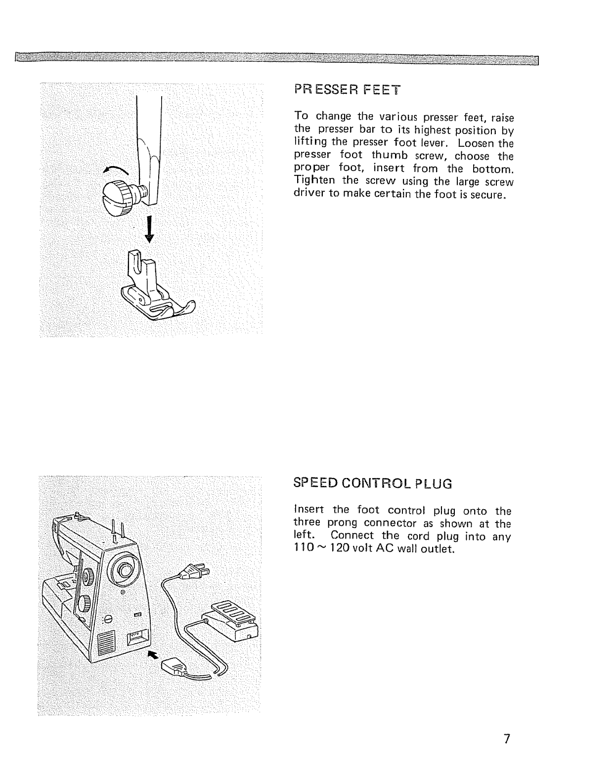 Presser feet, Speed control plug .............. 7