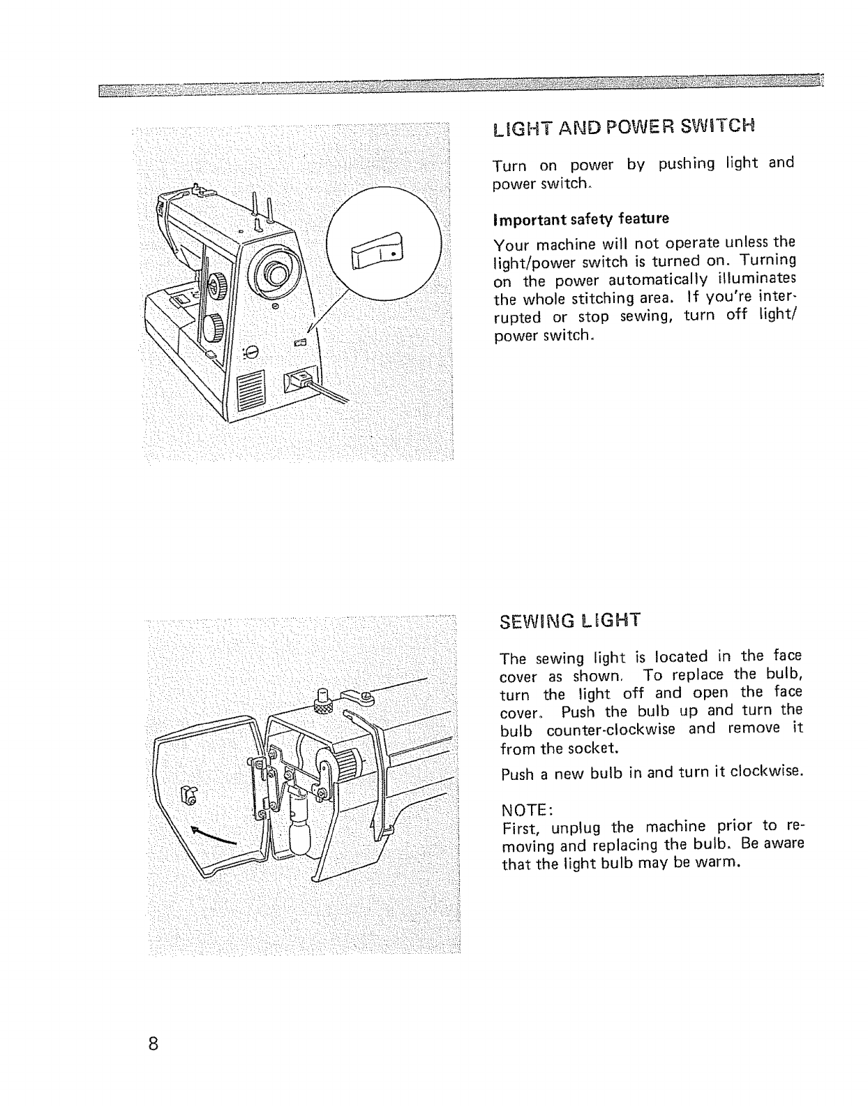 Light and power switch, Sewing light .......... 8