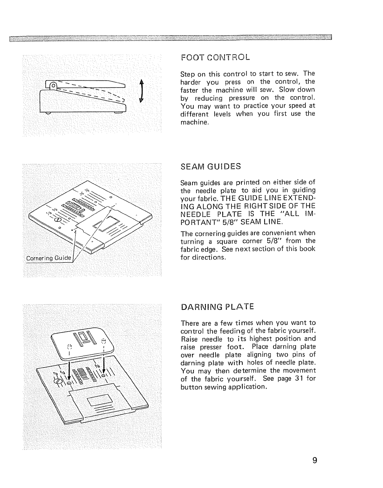 Foot control, Seam guides, Darning plate ....... 9