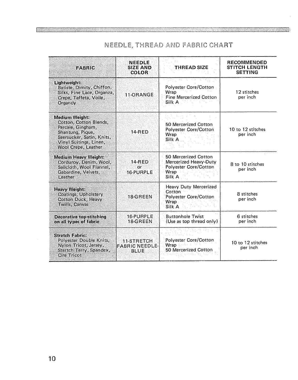 Needle, thread and fabric chart .............. 10