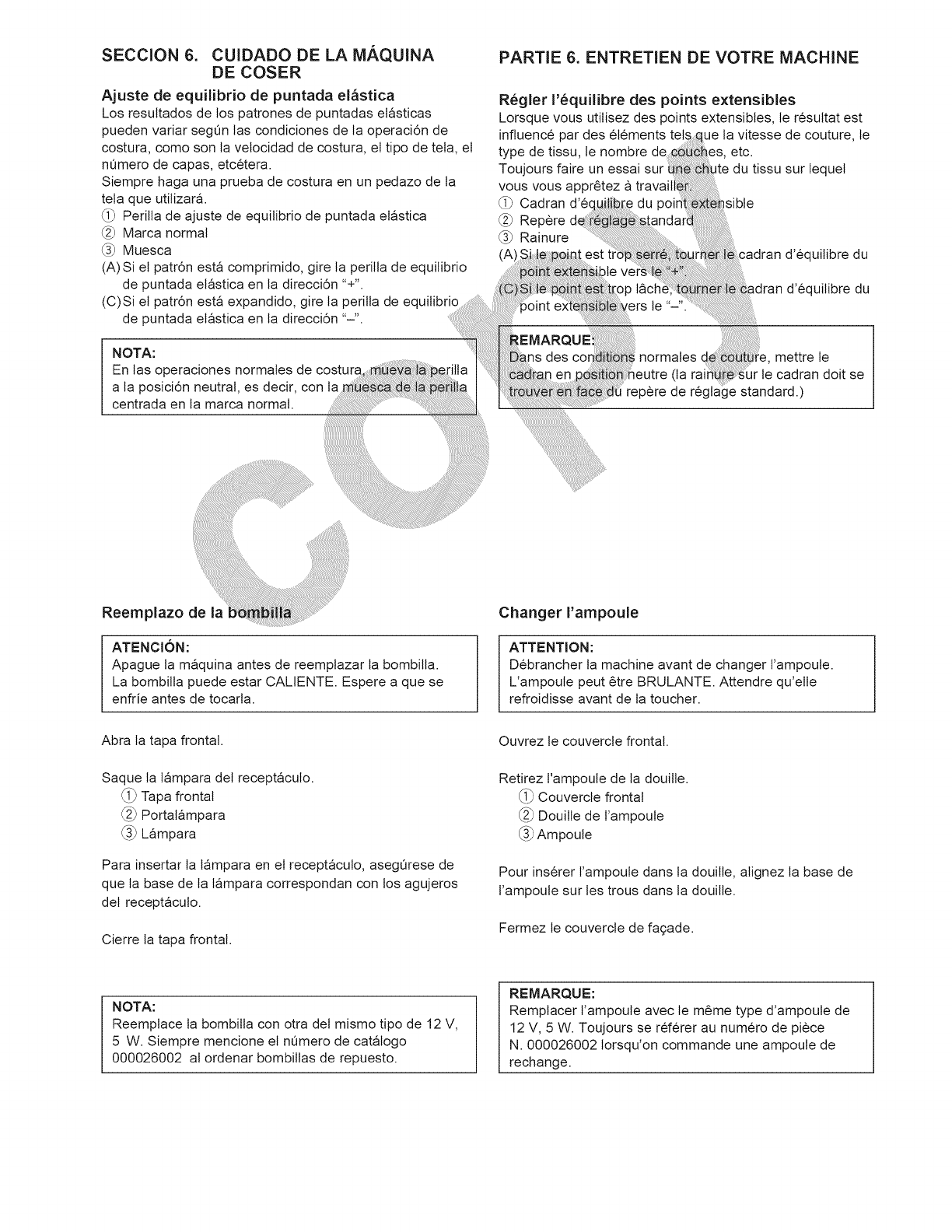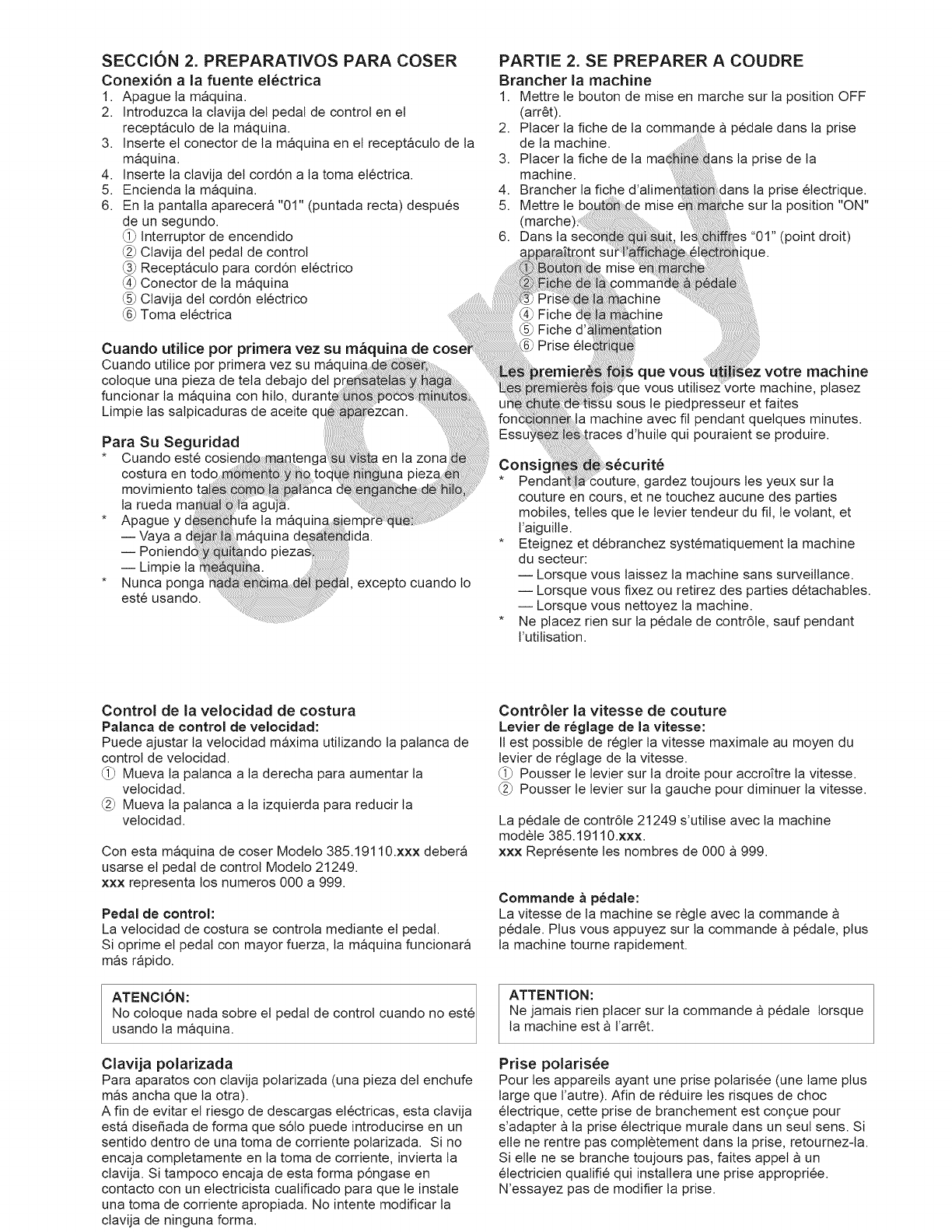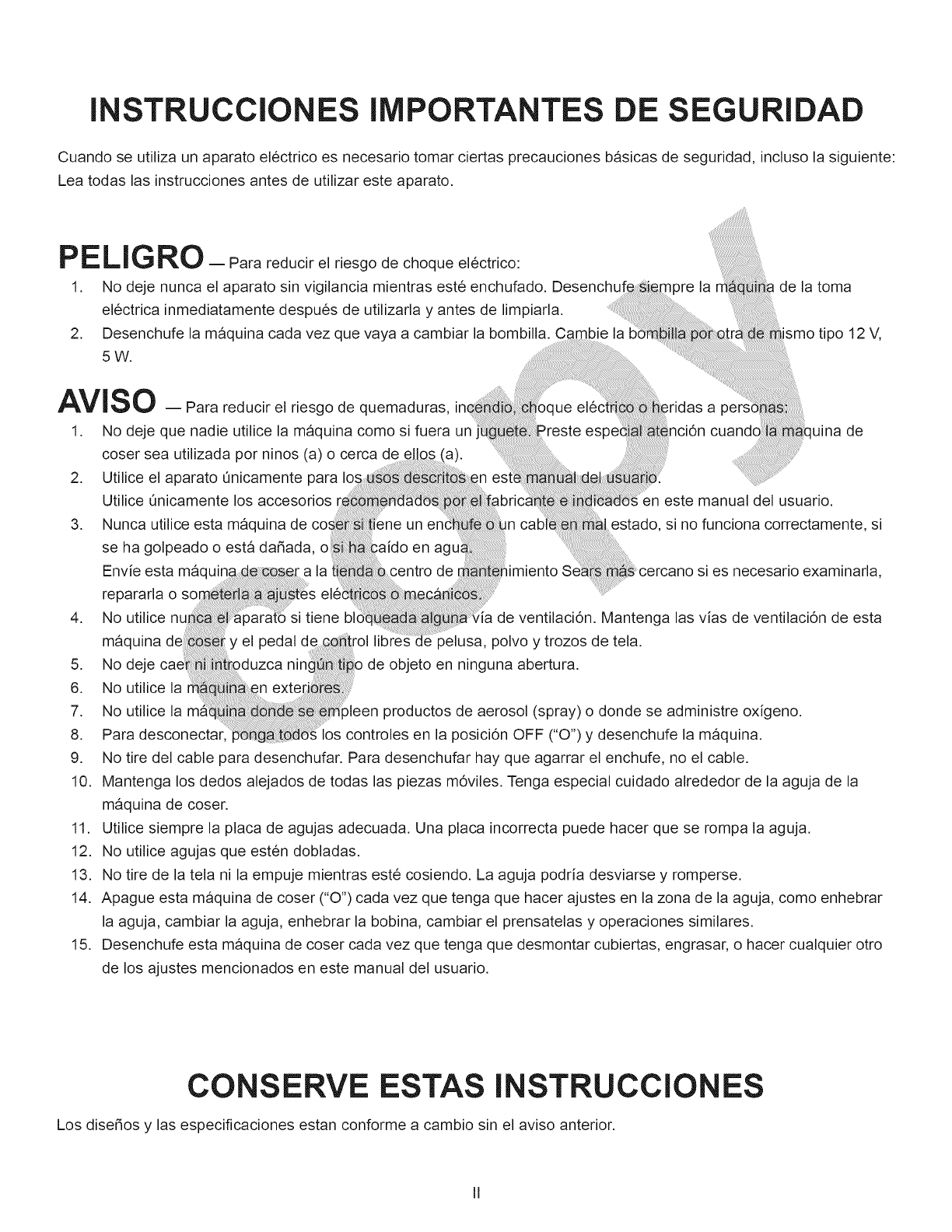 15. Desenchufe esta maquina de coser cada vez que tenga que desmontar cubiertas, engrasar, o hacer cualquier otro