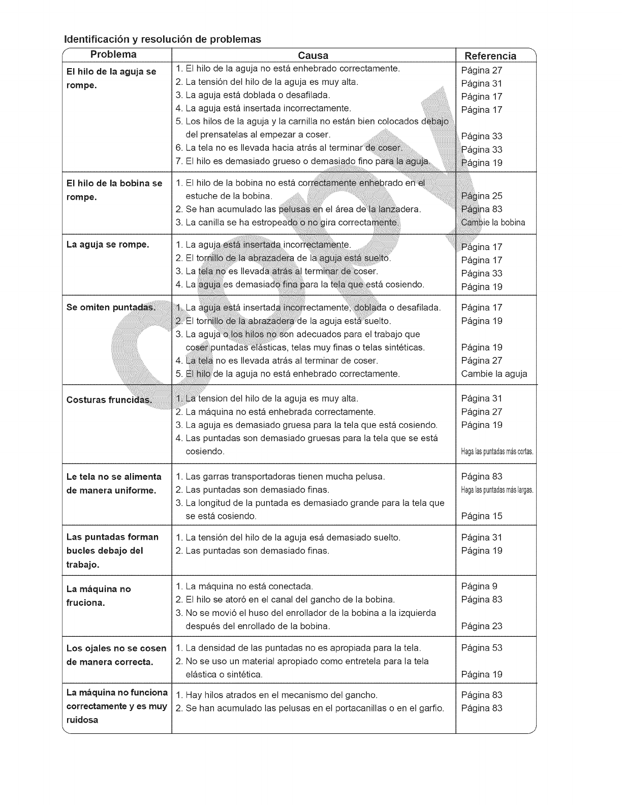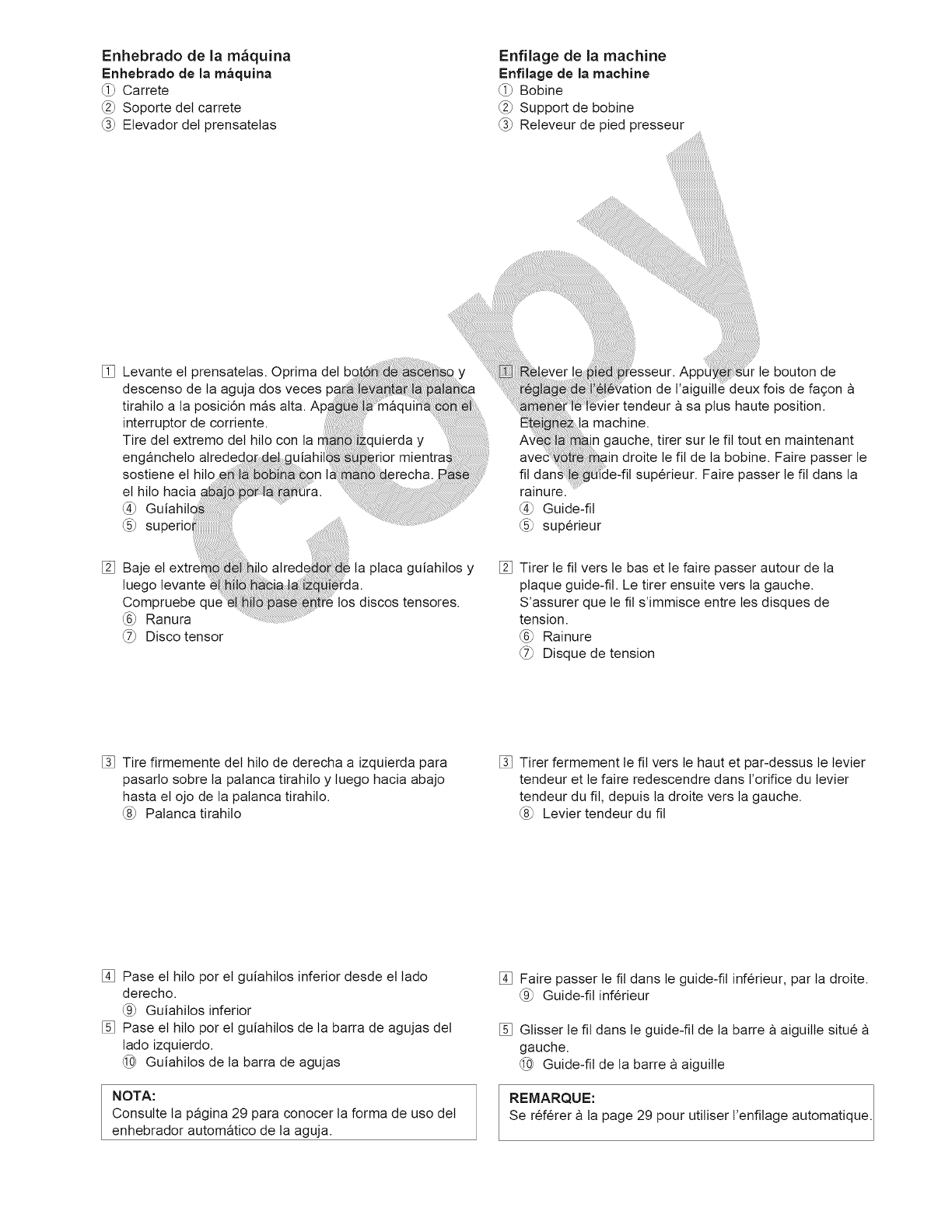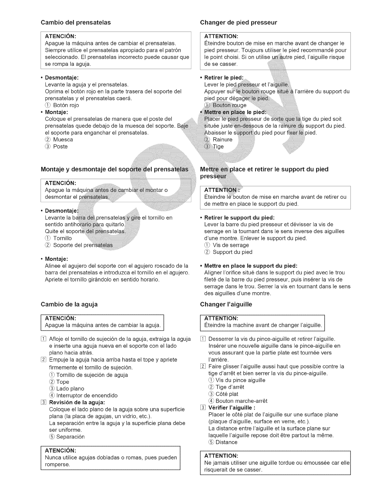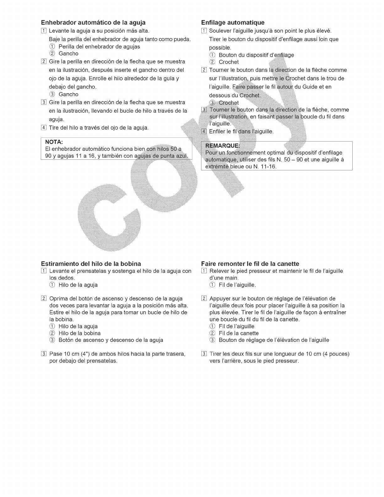 la aguja, cambiar la aguja, enhebrar la bobina, cambiar el prensatelas y operaciones similares.