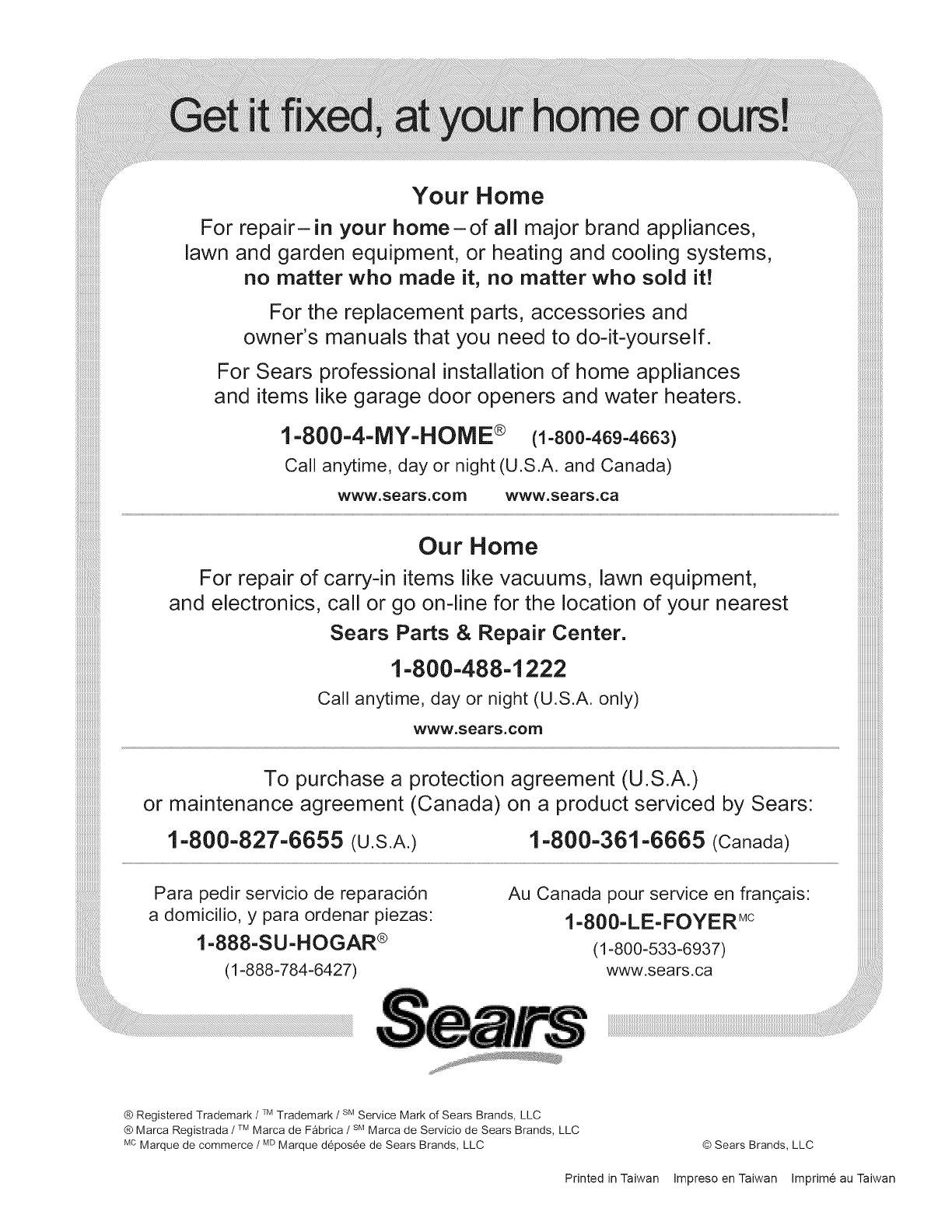 (I-888-784-6427) www.sears.ca