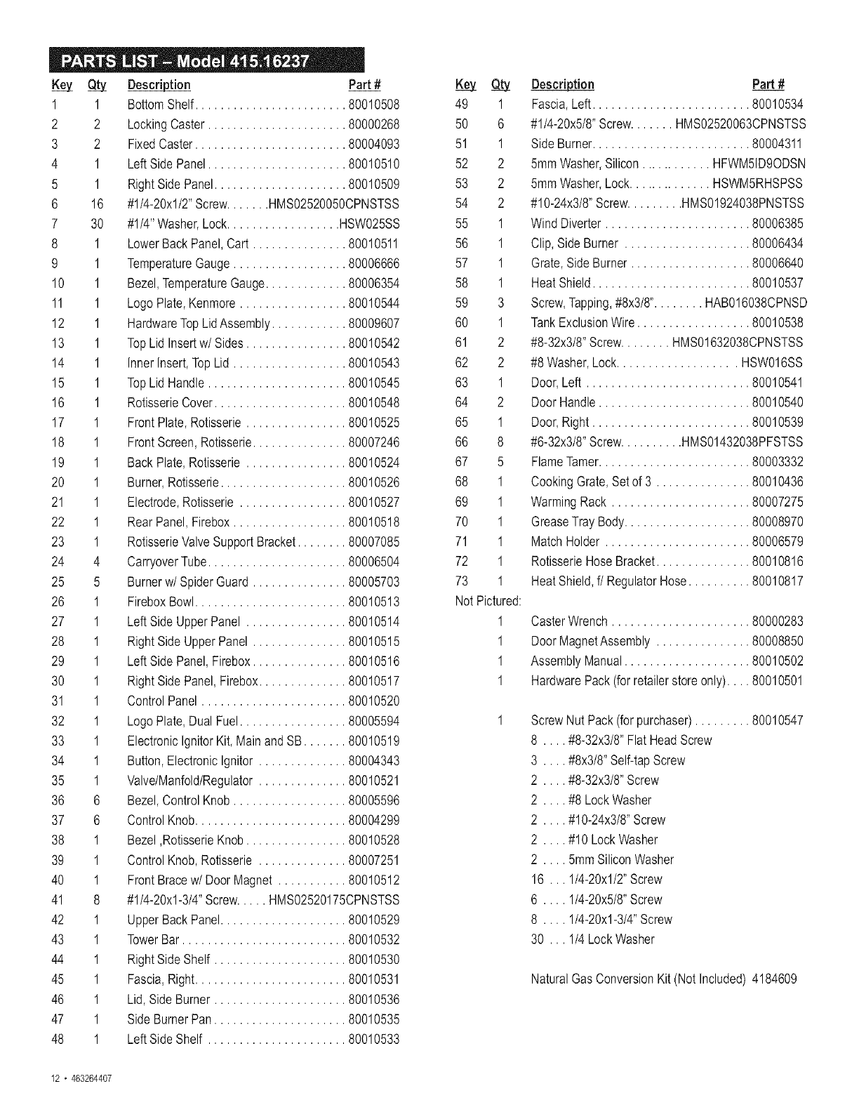 User Manual: Kenmore 41516237 41516237 KENMORE GAS GRILL - Manuals and Guides View the owners manual for your KENMORE GAS GRILL #41516237. Home:Lawn & Garden Parts:Kenmore Parts:Kenmore GAS GRILL Manual