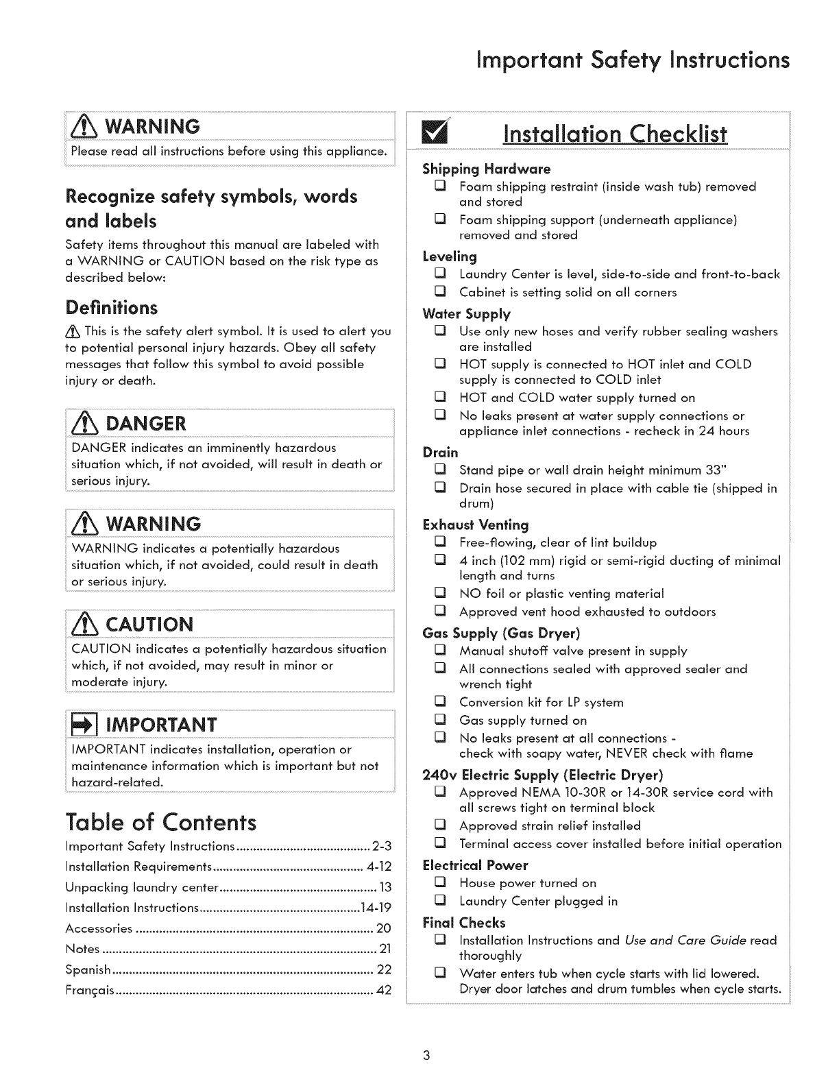 Read all of the following instructions before installing and using this appliance: