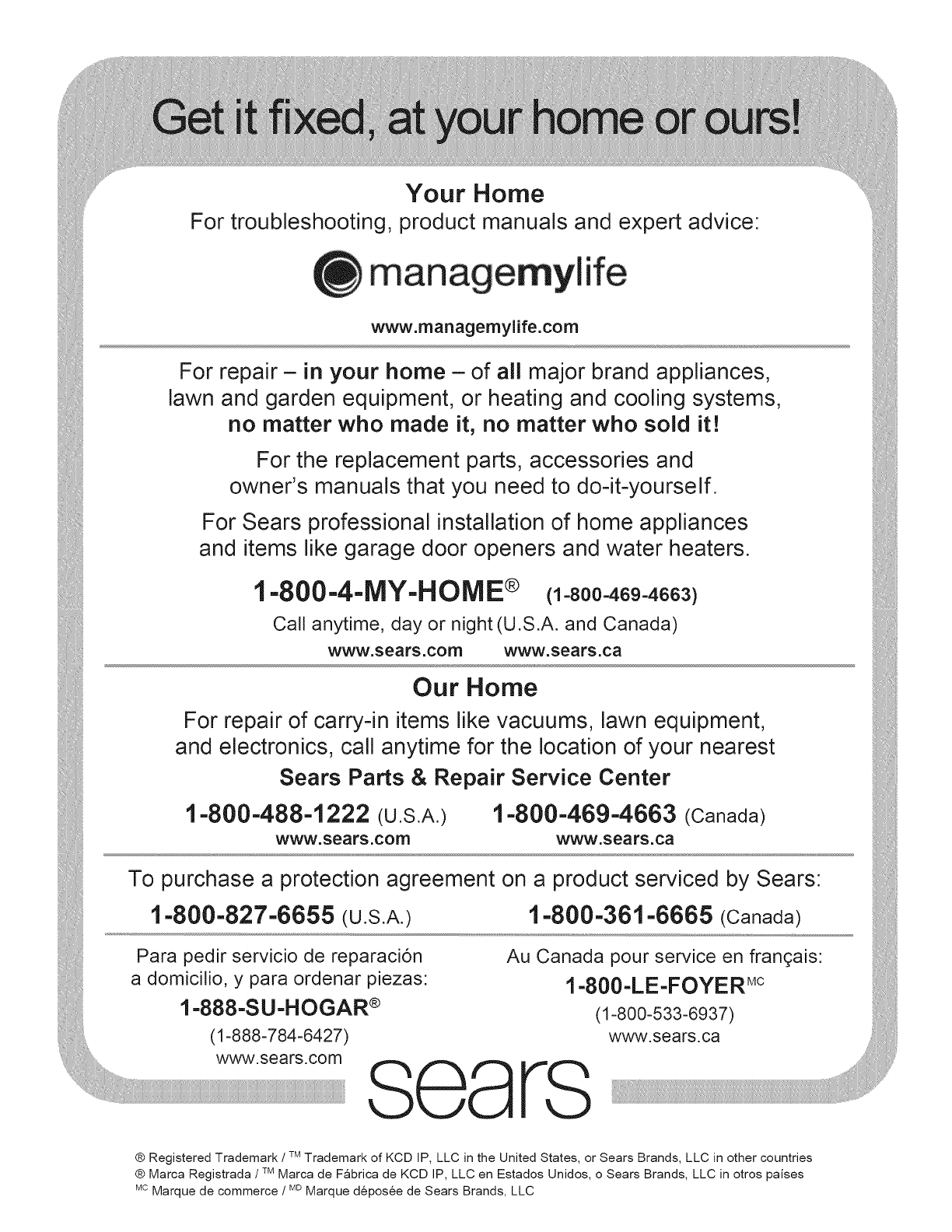 ® Registered Trademark /TMTrademark of KCD IP, LLC in the United States, or Sears Brands, LLC in other countries