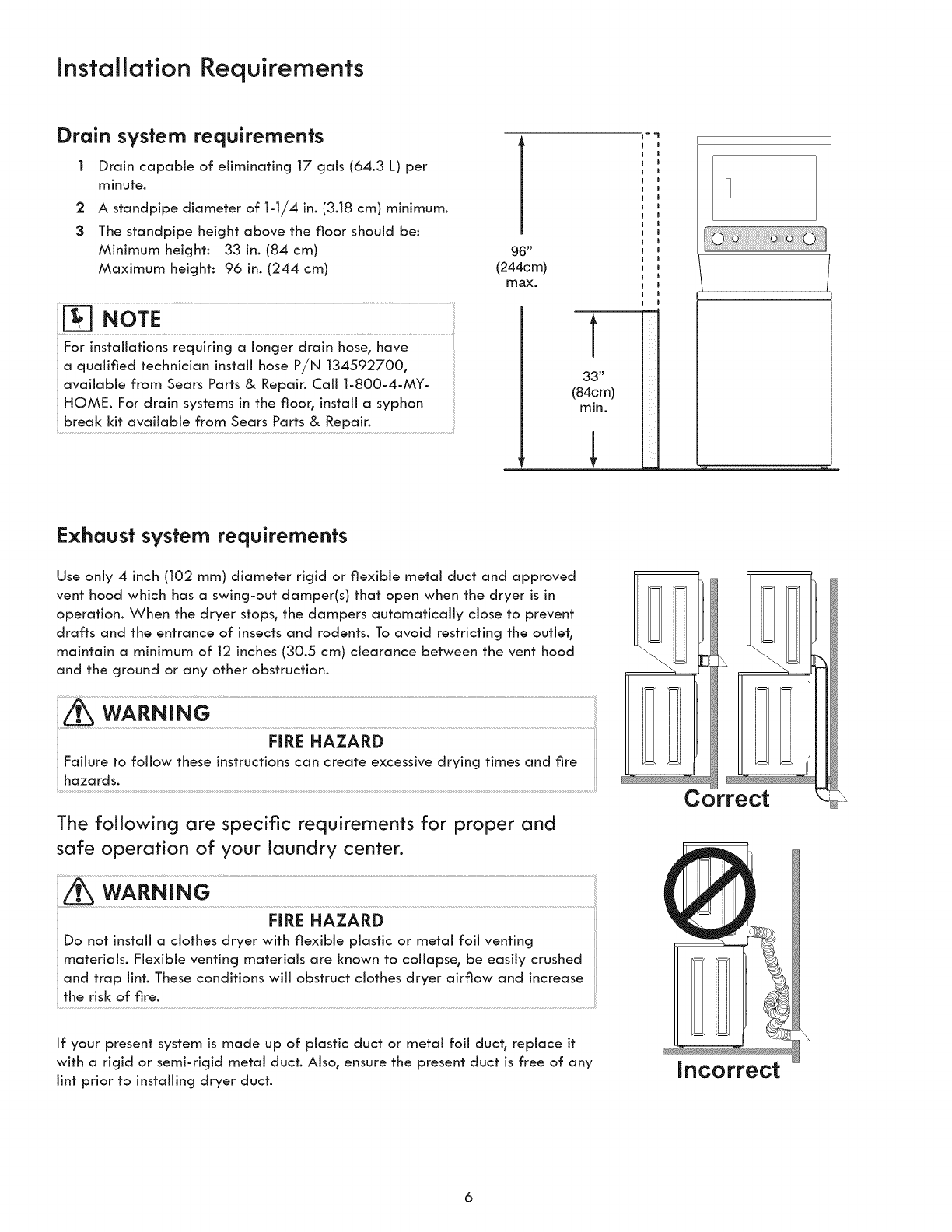 °Do not install a clothes dryer with flexible plastic or flexible foil venting material. Flexible venting materials are