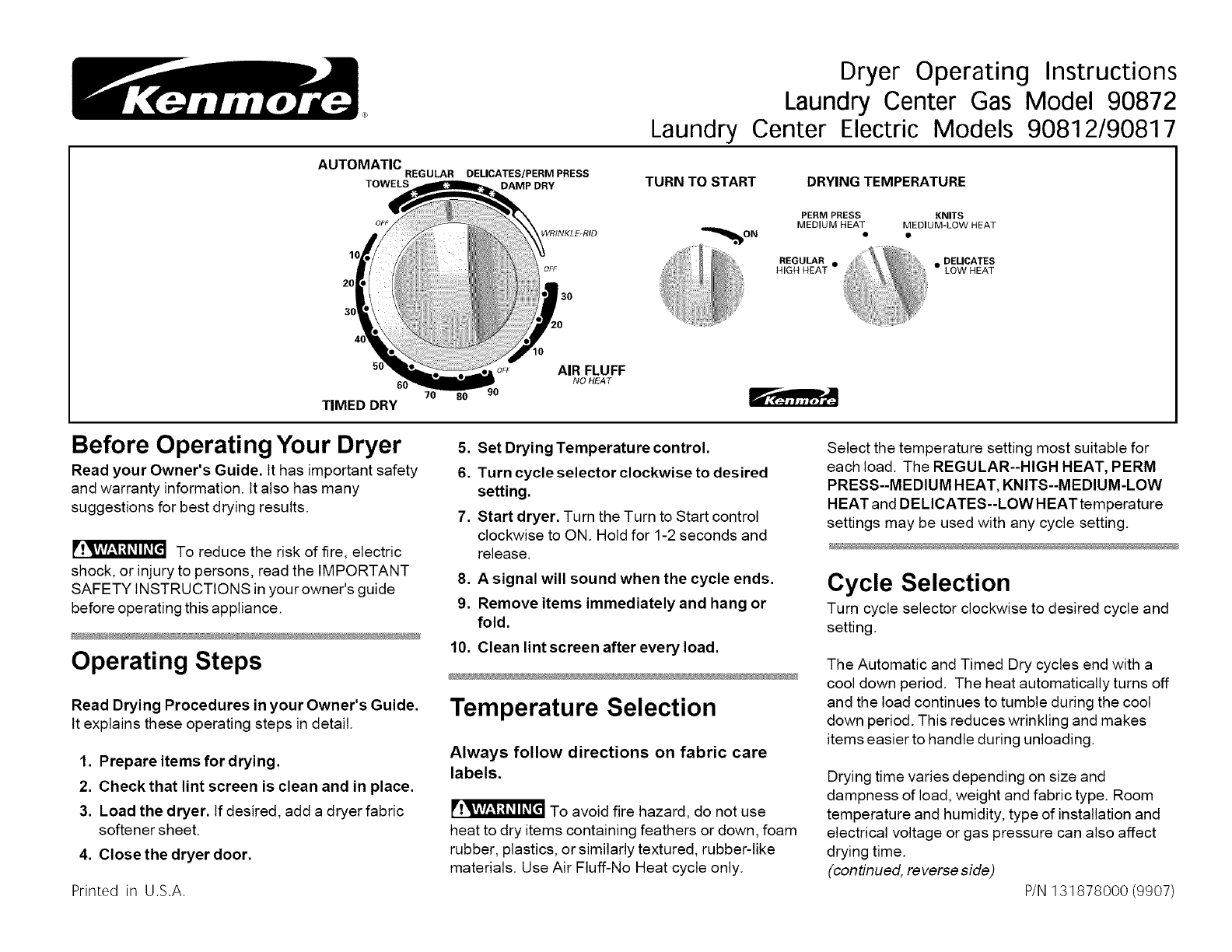 Kenmore 41790872990 User Manual LAUNDRY CENTER Manuals And Guides L0805295