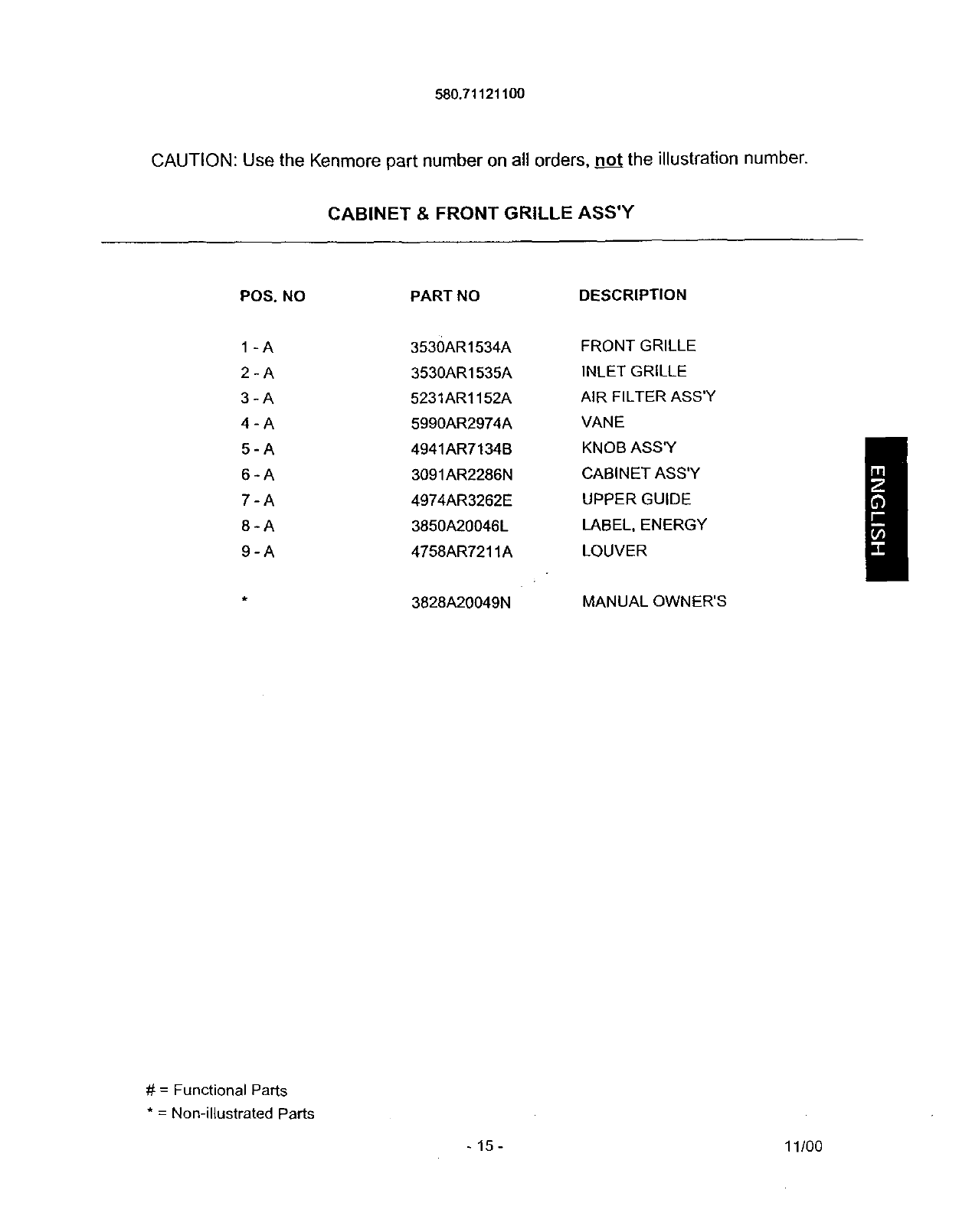 User Manual: Kenmore 58071121100 58071121100 KENMORE AIR CONDITIONER - Manuals and Guides View the owners manual for your KENMORE AIR CONDITIONER #58071121100. Home:Heating & Cooling Parts:Kenmore Parts:Kenmore AIR CONDITIONER Manual