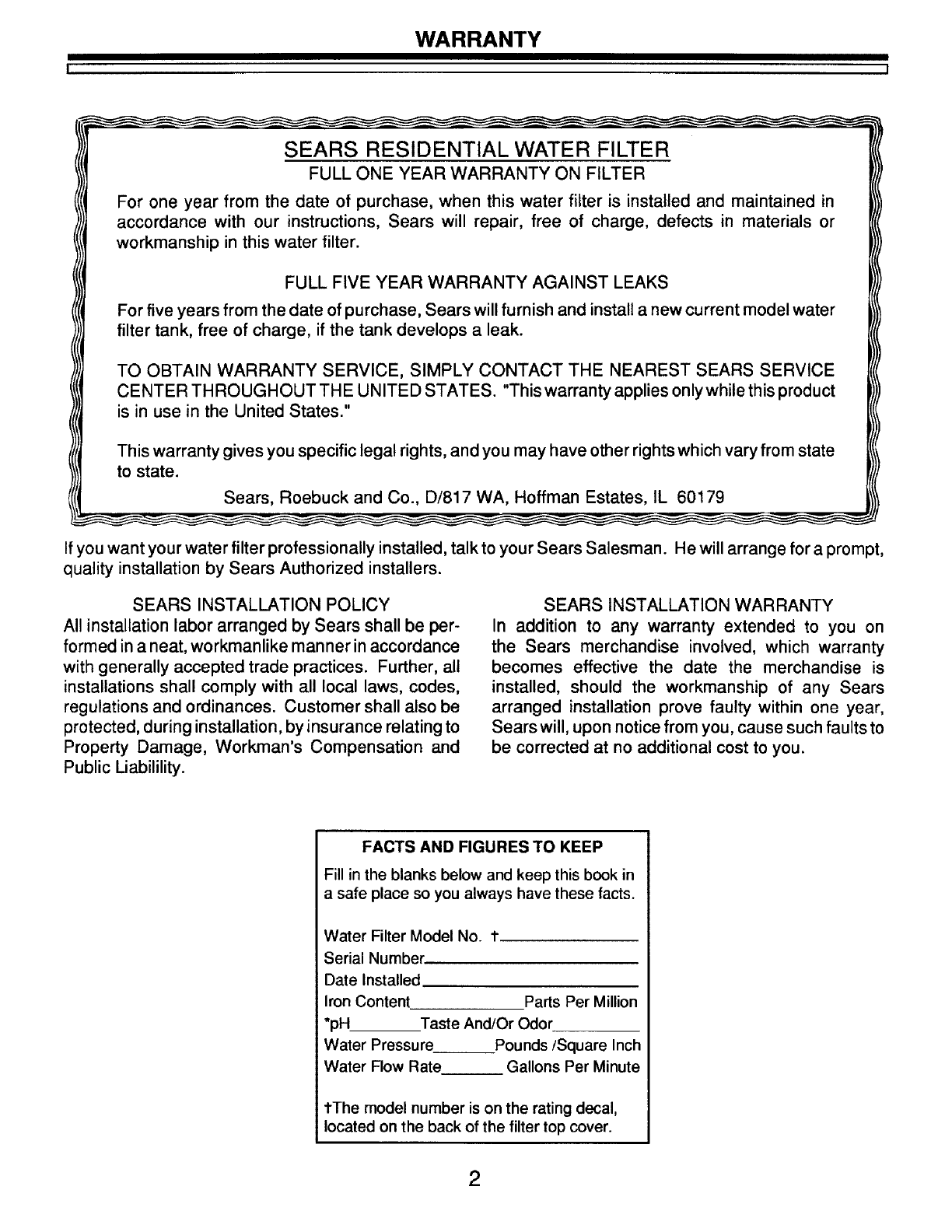 SEARS INSTALLATION WARRANTY