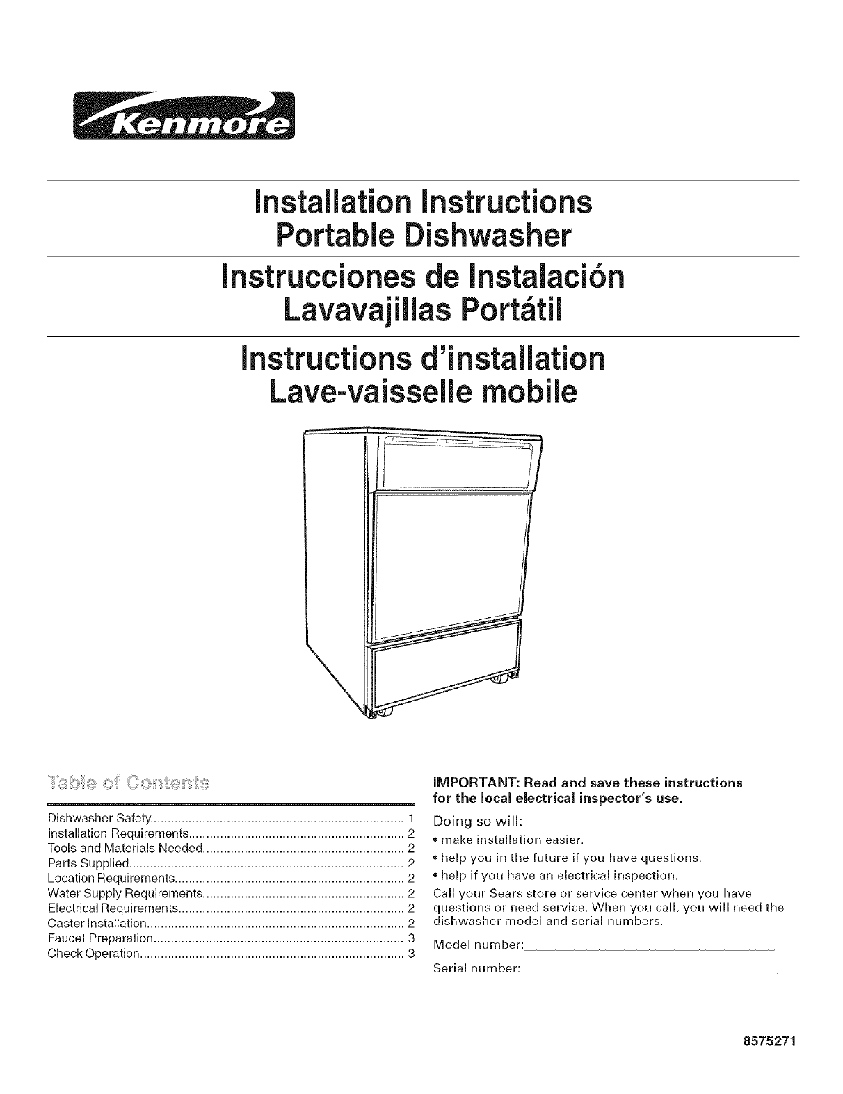 KENMORE Dishwasher Manual L0603148 KENMORE Dishwasher Owner's Manual, KENMORE Dishwasher installation guides