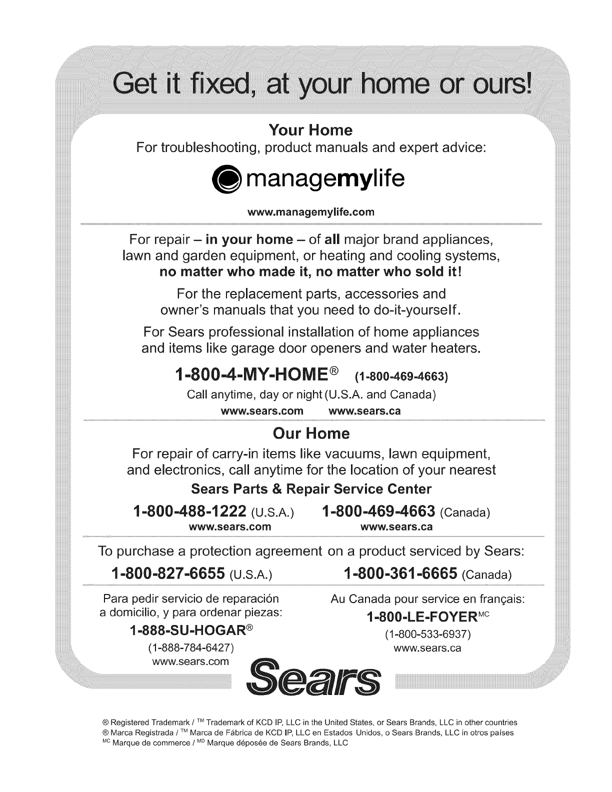 (1-888-784-6427 www.sears.ca