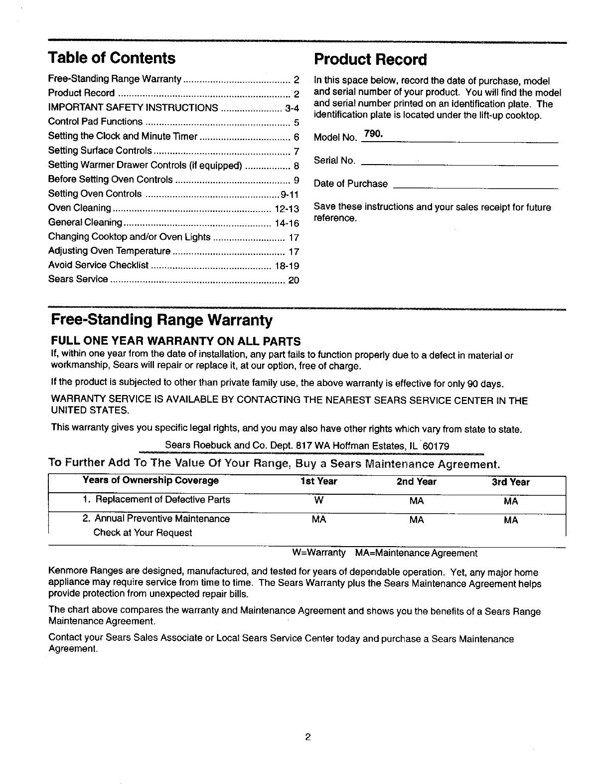 appliance may require service from time to time. The Sears Warranty plus the Sears Maintenance Agreement helps
